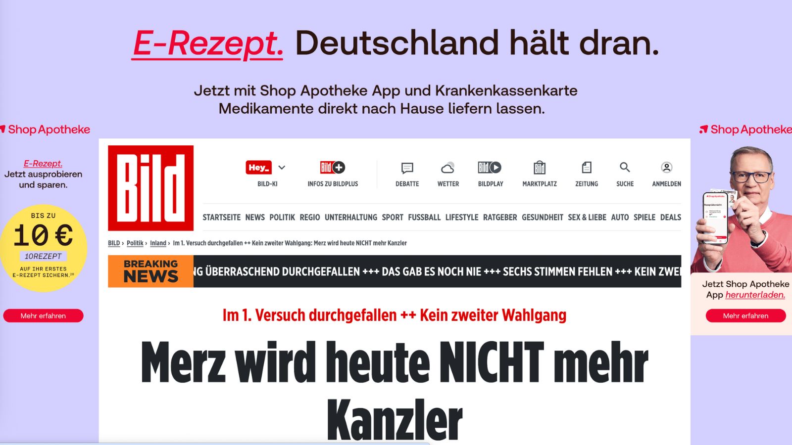 Redcare hat sich mit einer Werbekampagne am Tag der geplanten Kanzlerwahl wieder Aufmerksamkeit bei Bild.de gesichert. Der niederländische Versender wirbt großflächig und umrahmt den Aufmacher des Boulevardmediums – und während Friedrich Merz (CDU) seine Niederlage wegstecken muss, lächelt das Shop Apotheke-Testimonial Günther Jauch.