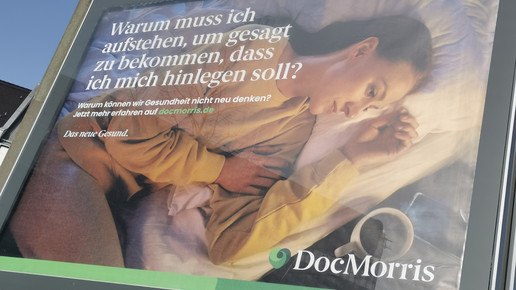 Doch DocMorris hat nicht nur plakatiert, sondern auch einen Spot produziert. Darin heißt es entsprechend: „Alles wird doch digital, nur zu meinem Arzt gehe ich noch zu Fuß.“ Klar, vertraue man immer noch dem Doktortitel an der Wand, wenn es um Gesundheit gehe. „Aber muss ich wirklich immer da sitzen und auf diese Wand starren?“, fragt sich die Stimme aus dem Off, während ein junger Mann in einem überfüllten Wartezimmer sitzt.