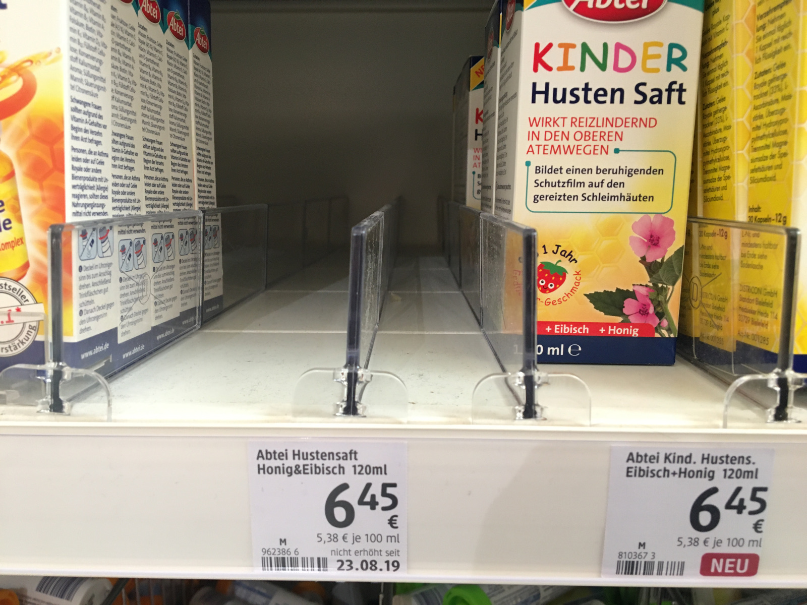 Von dem Saft können Kinder ab einem Jahr bis zu dreimal täglich je 5 ml einnehmen. Bei älteren Kindern kann die Gabe erhöht werden. Abtei vertreibt bereits für Patienten ab zwölf Jahren einen Hustensaft mit Eibisch und Honig. Für die Erwachsenen-Variante gab es zuletzt Kritik an der Werbeaussage des Herstellers: Nach einem Beschluss des Oberlandesgerichts Hamm (OLG) darf er nicht mehr behaupten, sein „Abtei Husten Saft Eibisch und Honig“ wirke gegen alle Arten von Husten.