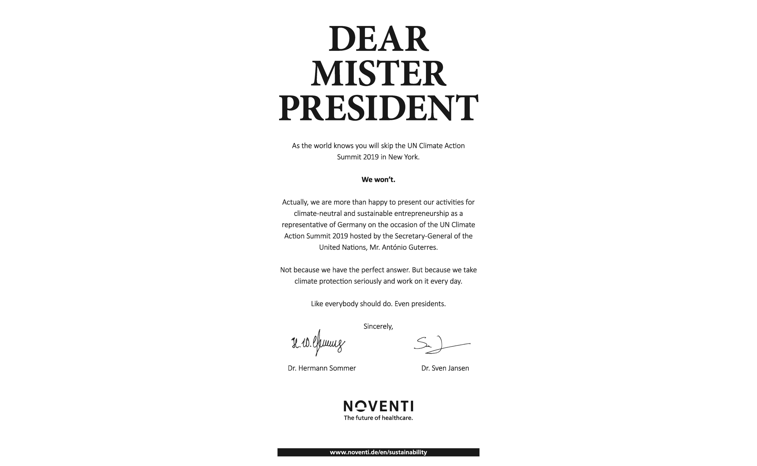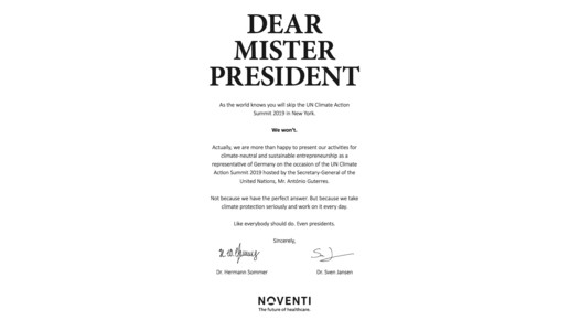 Der Brief wird auch in der Bild-Zeitung sowie dem Handelsblatt veröffentlicht. Noventi-Vorstand Dr. Sven Jansen: „In unserem offenen Brief fordern wir den Präsidenten der Vereinigten Staaten dazu auf, zu handeln. Er ist zuvorderst für die Bewahrung unserer Lebensgrundlagen verantwortlich. Dem Klima kann sich niemand entziehen. Damit wollen wir aufrütteln und zeigen, dass jeder für umweltbewusstes Verhalten verantwortlich ist – vom Kind bis zum Staatsoberhaupt. Aber insbesondere der Präsident der Vereinigten Staaten von Amerika darf sich dem nicht entziehen. Er muss Vorbild und Leader zugleich sein – auf dem Weg zu einem besseren Klima, einer besseren Umwelt und einer besseren Gesundheit.“