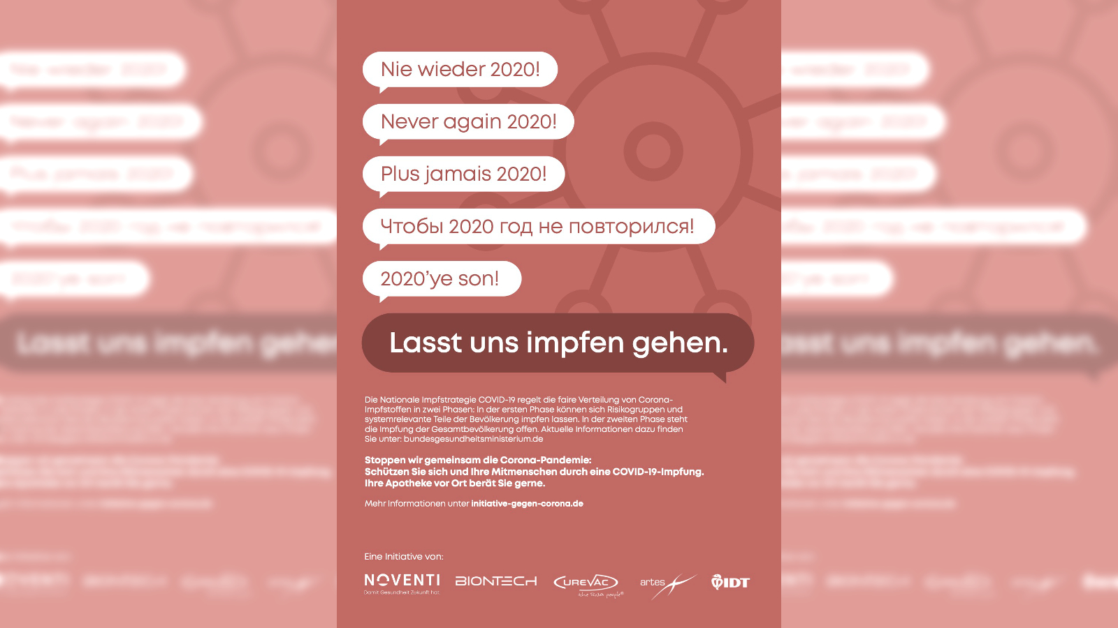 Unter dem Motto „Nie wieder 2020: Lasst euch impfen“ ruft Noventi im Rahmen der „Initiative gegen Corona“ und zusammen mit vier Impfstoffherstellern zur Impfung auf. Die mehrsprachigen Plakate werden an alle Apotheken verschickt.