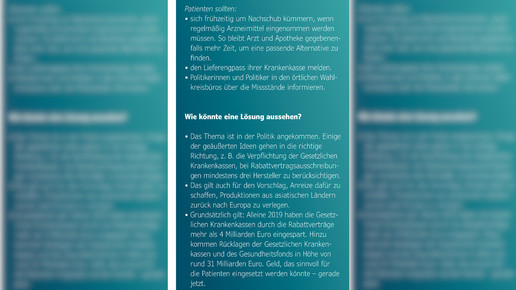 Nur so lasse sich der Druck auf Politik und Kassen erhöhen, bis endlich nachhaltige Lösungen gefunden würden. „Zusätzlich freuen wir uns natürlich, wenn wir durch unser Informationsmaterial zur Entlastung der Apotheken im Tagesgeschäft beitragen können“, so Kuck weiter.