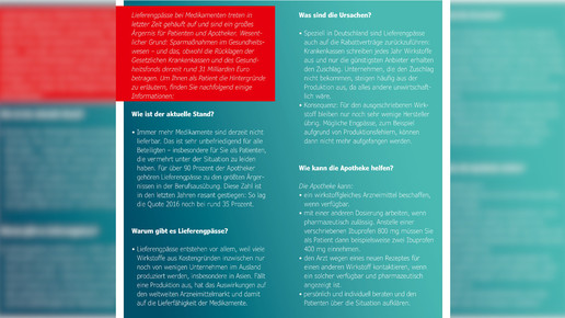 Die Kampagne zeige bei den Apothekenkunden bereits ihre Wirkung. „Wir geben uns größte Mühe, den Menschen die Situation zu erklären. Die Hintergründe zu den Lieferengpässen schriftlich in der Hand zu haben, erhöht unsere Glaubwürdigkeit und reduziert so manchen Unmut“, berichtet etwa Apothekerin Christine Zentgraf von der Genius-Apotheke in Hilders.