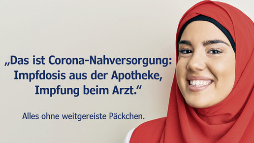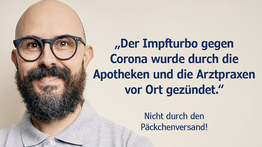 Die Botschaften auf den ersten beiden Plakaten: „Jede Corona-Impfdosis vom Hausarzt kommt aus einer Apotheke vor Ort – und nicht aus einem Päckchen“ sowie „So geht Impfturbo: Ärzte und Apotheken verantworten gemeinsam über 30 Mio. Impfungen gegen Corona – Nicht am Start: Der Päckchenversand.“