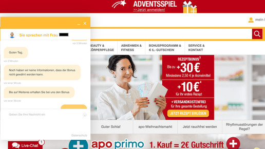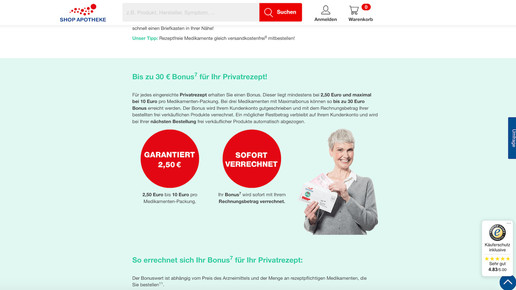 Nach wie vor gibt es aber bis zu 30 Euro Bonus für Privatversicherte: „Für jedes eingereichte Privatrezept erhalten Sie einen Bonus. Dieser liegt mindestens bei 2,50 Euro und maximal bei 10 Euro pro Medikamenten-Packung. Bei drei Medikamenten mit Maximalbonus können so bis zu 30 Euro Bonus erreicht werden. Der Bonus wird Ihrem Kundenkonto gutgeschrieben und mit dem Rechnungsbetrag Ihrer bestellten frei verkäuflichen Produkte verrechnet. Ein möglicher Restbetrag verbleibt auf Ihrem Kundenkonto und wird bei Ihrer nächsten Bestellung frei verkäuflicher Produkte automatisch abgezogen.“