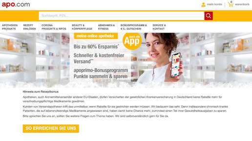 Auch Apo.com hat nun seine Rx-Boni gelöscht. Die niederländische Schwester von Apo-Discounter hatte nach Inkrafttreten des Apothekenstärkungsgesetzes (VOASG) zunächst Boni von bis zu 30 Euro gewährt.