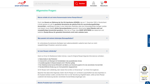 Shop-Apotheke verweist auf das VOASG: Damit gelte für gesetzlich Versicherte der gleiche Preis für verschreibungspflichtige Arzneimittel, „unabhängig ob diese in einer stationären Apotheke oder einer Versandapotheke bezogen werden“. Weiter heißt es: „Laut diesem neuen Gesetz dürfen Versandapotheken gesetzlich Versicherten keine Rabatte mehr auf rezeptpflichtige Arzneimittel gewähren. Dies hat zur Folge, dass Shop Apotheke den bekannten und beliebten Rezept-Bonus für gesetzlich Versicherte nicht mehr anbieten kann.“ Vorhandene Guthaben auf den Kundenkonten könnten weiterhin beim Kauf von nicht-rezeptpflichtigen Produkten verrechnet werden.