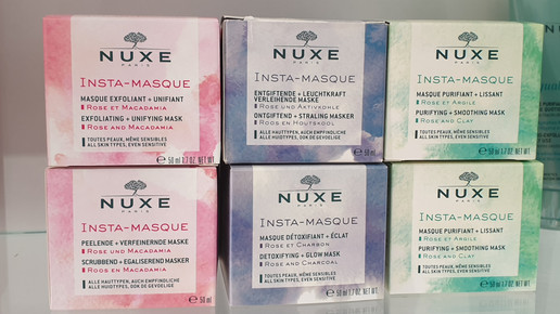 Die peelende und verfeinernde Maske kommt in einem pinken Packungsdesign daher: Sie enthält Rosenwasser und Macadamiaöl, sowie ein feines Peelingpulver natürlichen Ursprungs. Abgestorbene Hautzellen sollen entfernt und das Hautbild verfeinert werden. Die Gelee-Textur verwandelt sich beim Einmassieren in ein Öl. Die reinigende Maske befindet sich im grünen Tiegel der Serie: Neben Rosenwasser ist weiße Tonerde enthalten, um die Haut sanft zu reinigen. Die dritte Maske ist das Detox-Produkt der Serie: Im schwarzen Tiegel findet sich die Gesichtsmaske mit Aktivkohle: Die Haut soll entgiftet werden und von Schmutzpartikeln und Talg befreit werden. Die tiefschwarze Geleetextur verwandelt sich beim Kontakt mit Wasser in eine Milch und lässt sich einfach abwaschen.