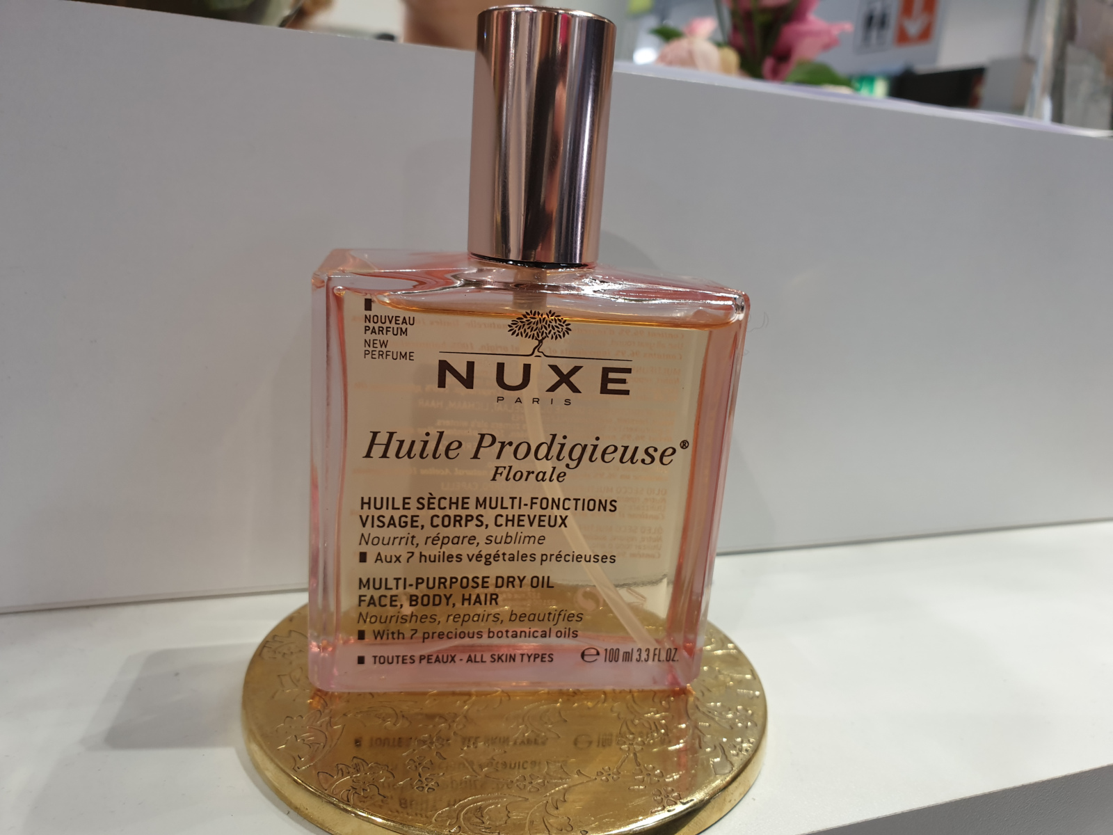 Neu ist neben dem Absolu auch das Huile Prodigieuse Florale: Das klassiche Nuxe- Öl mit einem neuen, zarten Blütenduft. Verwendet wurde die gleiche Trockenöltextur des Klassikers und auch die Anwendung bleibt gleich. Zentrale Inhaltsstoffe sind Tsubaki-Öl, Arganöl, Macadamiaöl, Borretschöl, Kamelienöl, Haselnussöl und Süßmandelöl. Der neue blumige Duft kommt durch Noten von Grapefruitschale, Magnolie und Moschus zustande.