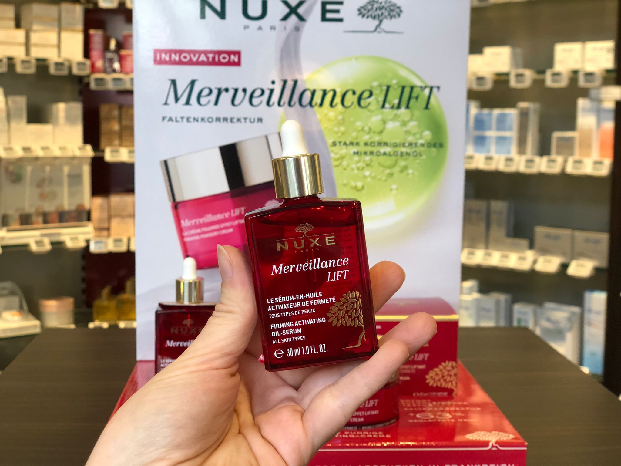 Nuxe setzt mit der Anti-Aging-Pflege Merveillance Lift auf die Zielgruppe der 35- bis 50-Jährigen. Die Nachfrage dieser Altersgruppe sei vorhanden, so Heurich. Die neuen Produkte enthalten Mikroalgenöl aus Chlorella vulgaris, das ausgeprägte Falten auffüllen und die Haut straffen soll. Die zuvor gleichnamige Serie wurde von den Newcomern abgelöst. Die Apotheken können zwei Tagescremes, eine Nachtpflege sowie ein Serum und eine Augenpflege beziehen.