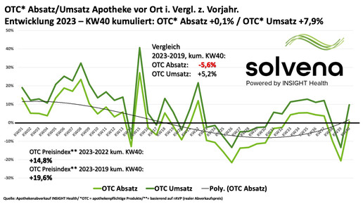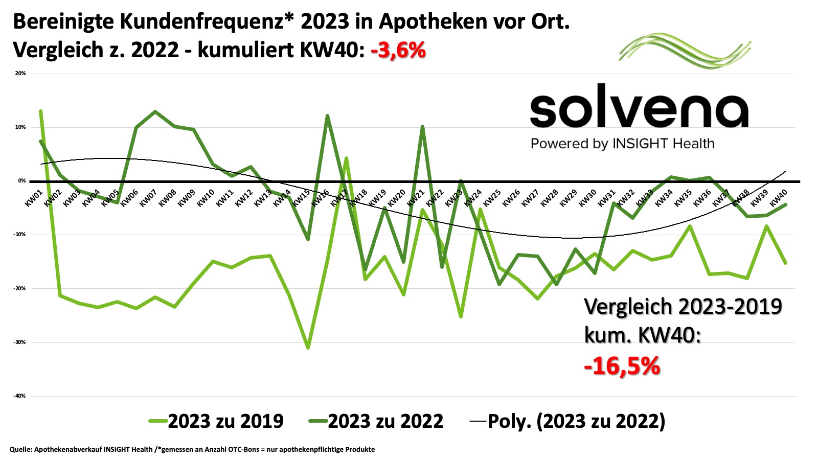 Im Vergleich zu 2022 liegt die Zahl der Bons laut Insight Health nach wie 3,6 Prozent niedriger. Immerhin: Nachdem die starken Zugewinne zum Jahresbeginn durch einen schwachen Sommer aufgezehrt wurden, stabilisierte sich die Kundenfrequenz zuletzt wieder. Im Vergleich zu 2019 ist allerdings ein Minus von 16,5 Prozent zu verzeichnen.