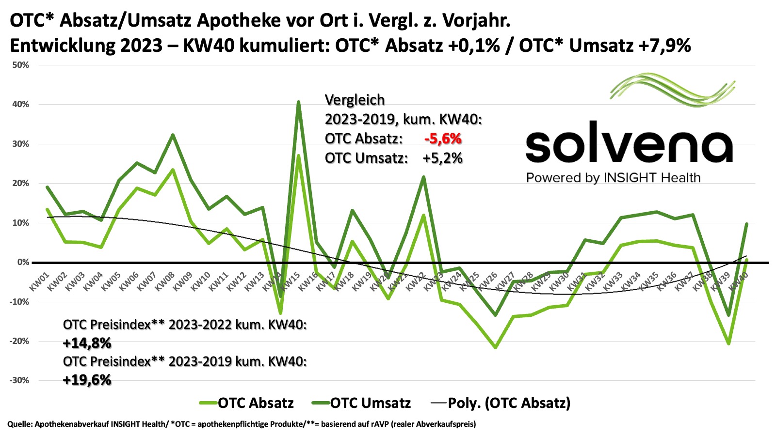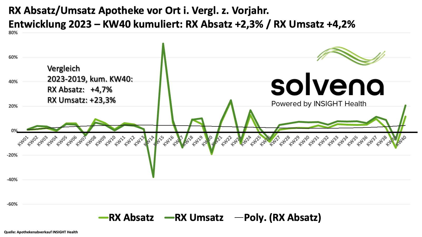 Nach wie vor stabil entwickelt sich das Rx-Geschäft: Hier wuchs der Umsatz gegenüber 2022 um 4,2 Prozent, der Absatz legte immerhin um 2,3 Prozent leicht zu. Im Vergleich zu 2019 legte der Absatz um 4,7 Prozent zu, der Umsatz um 23,3 Prozent. Grund ist ein Sondereffekt: Seit September 2020 werden die hochpreisigen Hämophilie-Präparate wieder über die Apotheken vertrieben.