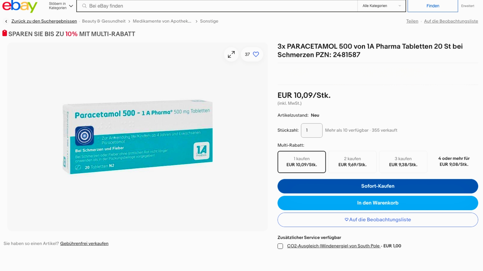 Nimmt die Kundschaft nun zwei Dreierpakete ab, verringert sich der Preis bei einigen Händler:innen pro Paket; „Multi-Rabatt“ nennt Ebay das. Maximal 10 Prozent soll der Käufer hier sparen können. So erreichen Kundinnen und Kunden beim Kauf von vier mal drei PCM-Packungen eine maximale Ersparnis von rund 11,12 Prozent; das ist sogar mehr, als Ebay als höchsten prozentualen Rabatt angibt.