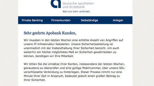 Die Apobank ist Opfer eines Phishing-Angriffs geworden. Unbekannte haben mit einer gefälschten Webseite des Instituts Daten und Geld einer noch unbekannten Zahl an Kunden erbeutet, darunter Mobiltelefonnummern. Das Geldhaus betont, dass die Betrugsmasche außerhalb seines eigenen Bankingsystems stattgefunden hat. Für die Geschädigten müssten nun „individuelle Lösungen“ gefunden werden.