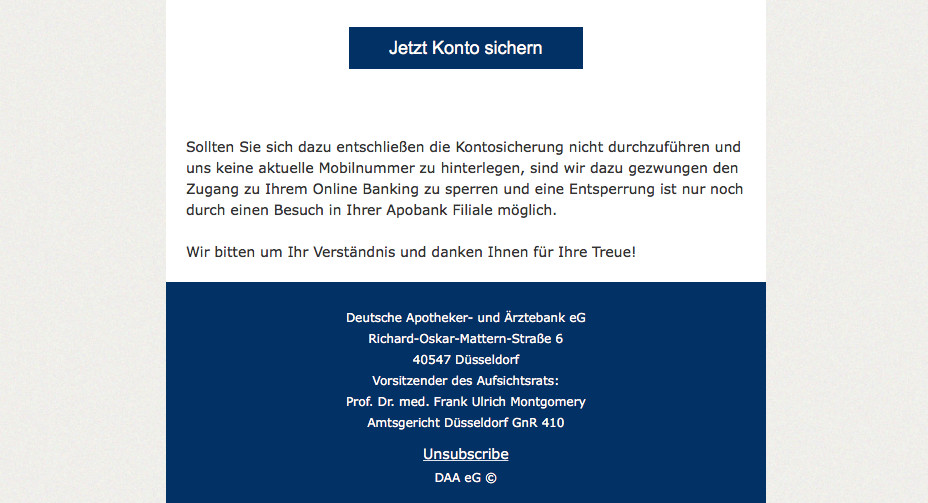 Im Februar hatten Betrüger E-Mails im Namen der Bank verschickt. „Wir mussten in den letzten Wochen eine erhöhte Anzahl von Angriffen auf unsere IT-Infrastruktur feststellen“, hieß es darin. Mit der Begründung wurden Nutzer aufgefordert, sich über einen Link einzuloggen und ihre Daten zu aktualisieren. Geschieht das nicht, werde das Konto gesperrt. Über den Button „Jetzt Konto sichern“ ihre Umsätze „genaustens“ prüfen. Auch damals wollten die Betrüger die Mobilfunknummern der Kunden haben.