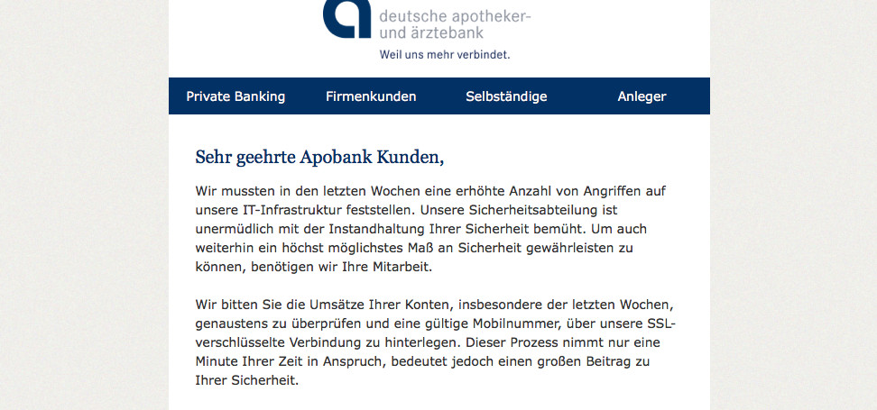 Bereits 2015 waren Spam-Mails im Namen der Apobank verschickt worden. Kunden wurden aufgefordert, ihre persönlichen Daten innerhalb von 14 Tagen zu bestätigen. Nach Ablauf dieser Frist falle eine Bearbeitungsgebühr von 79,95 Euro an. Angeschrieben wurden Bankkunden und andere Verbraucher.