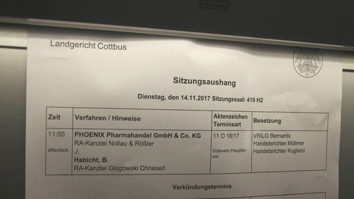 Die äußeren Bedingungen wirkten bescheiden. Mit den Prozessvertretern, den drei Richtern und vier Zuschauern war der kleine Sitzungssaal 419 am Landgericht Cottbus schon gut gefüllt. Dafür wurde schnell mit großen Zahlen hantiert: Phoenix hatte die EU-Versandapotheke ursprünglich auf Zahlung von 5,46 Millionen Euro verklagt, wegen nicht bezahlter Rechnungen. Nur ein kleiner Teil der anfänglichen Forderung ist mittlerweile beglichen oder verrechnet.