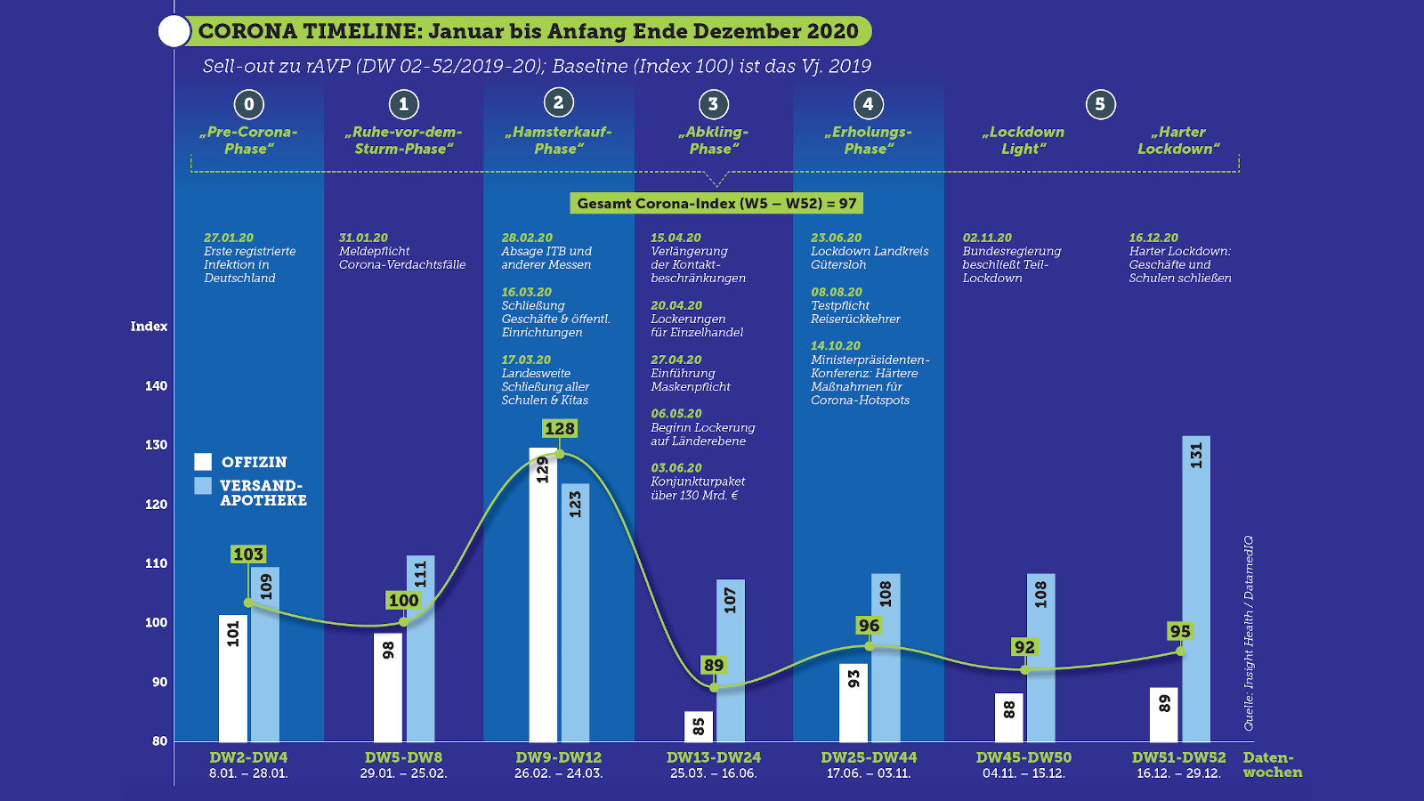 Hamsterkäufe blieben im zweiten Lockdown aus: Anders als im Shutdown zur ersten Infektionswelle sorgte der zweistufige Lockdown seit Anfang November nicht für zusätzliche Bevorratungskäufe durch die Verbraucher. Entsprechend blieben die vier Wochen im März der einzige Zeitraum des Jahres, in dem die Umsätze der Apotheken mit plus 29 Prozent signifikant über Vorjahr lagen. Seit Anfang November lagen sie rund 12 Prozent niedriger als im gleichen Zeitraum 2019.