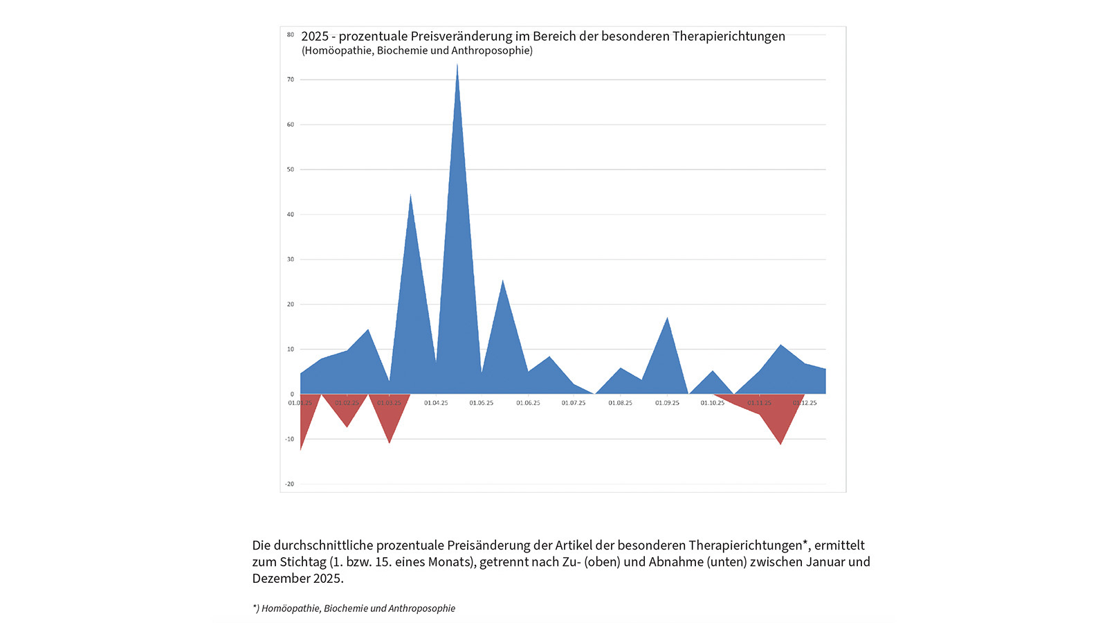 Diese Größenverhältnisse sind nach seinen Angaben relevant, da sich die Preisdynamik deutlich unterscheidet: Während das klassische OTC-Segment mit einer Preissteigerung von knapp 6 Prozent moderat über Inflationsniveau lag, verteuerten sich die Mittel der besonderen Therapierichtungen um mehr als 12 Prozent – nach bereits knapp 9 Prozent im Vorjahr.