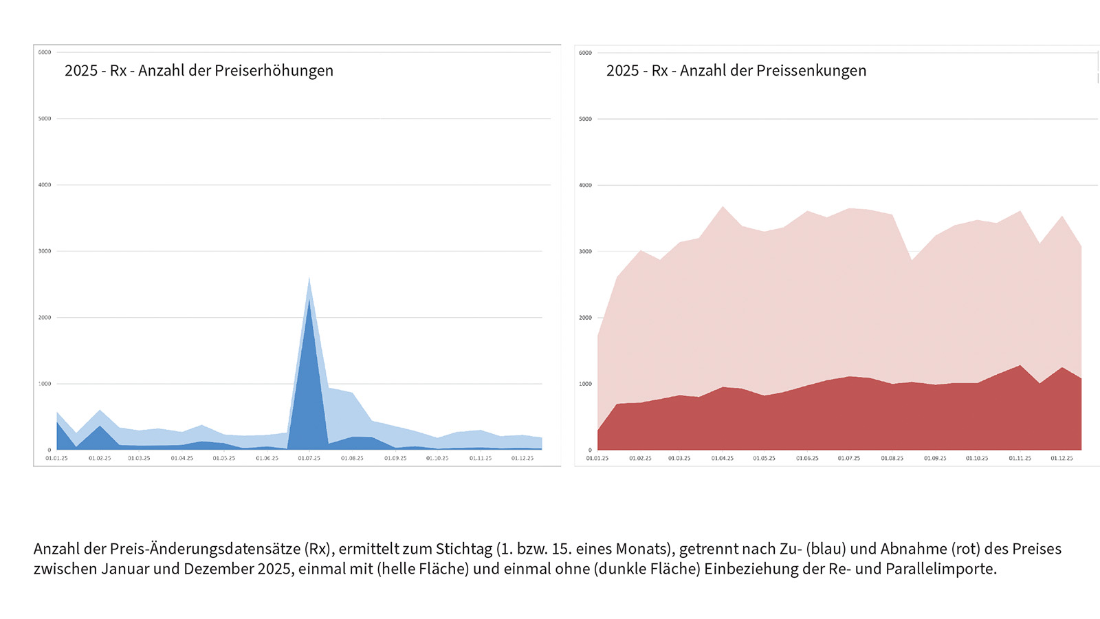 Die Preisdynamik auf dem Markt für verschreibungspflichtige Arzneimittel hat laut Analyse von Apo-Mall sich im Jahr 2025 gewandelt. Demnach gibt es zwei Trends: Rein mengenmäßig werden die Preisanpassungen von den Bewegungen im Segment der Re- und Parallelimporte dominiert; deren Preise ändern sich teilweise im Monatsrhythmus. Insgesamt gesehen werden die Änderungsmechanismen jedoch irregulärer und weniger vorhersehbar.