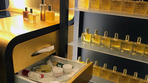 Blattgold in der Offizin: BD Rowa hat gemeinsam mit dem Kosmetikhersteller Nuxe und dem Ladenbauer Rheindesign ein Freiwahlregal konzipiert. Kunden werden per App informiert und mit Spiegel und passender Produktauswahl in die Themenwelt geleitet. Für das Konzept haben die Partner einen VISION.A-Award erhalten.