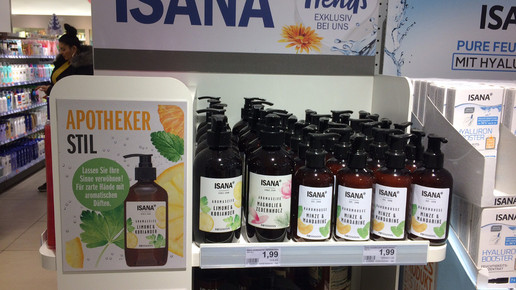 In den Filialen haben die Handpflegeprodukte in einem mannshohen Aufsteller Platz gefunden. Dieser wirbt mit dem „Apotheker Stil“. Die braunen PET-Flaschen sind im Design an Apothekergefäße angelehnt. „Lassen Sie Ihre Sinne verwöhnen! Für zarte Hände mit aromatischen Düften.“ Die veganen Aroma-Handseifen sind in den Varianten Limone & Koriander, Eukalyptus & Ingwer sowie Magnolie & Zedernholz erhältlich. Zum Sortiment gehört außerdem die Handmousse Minze & Mandarine. Alle Produkte sind für 1,99 Euro zu haben.