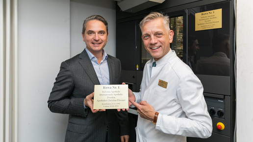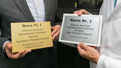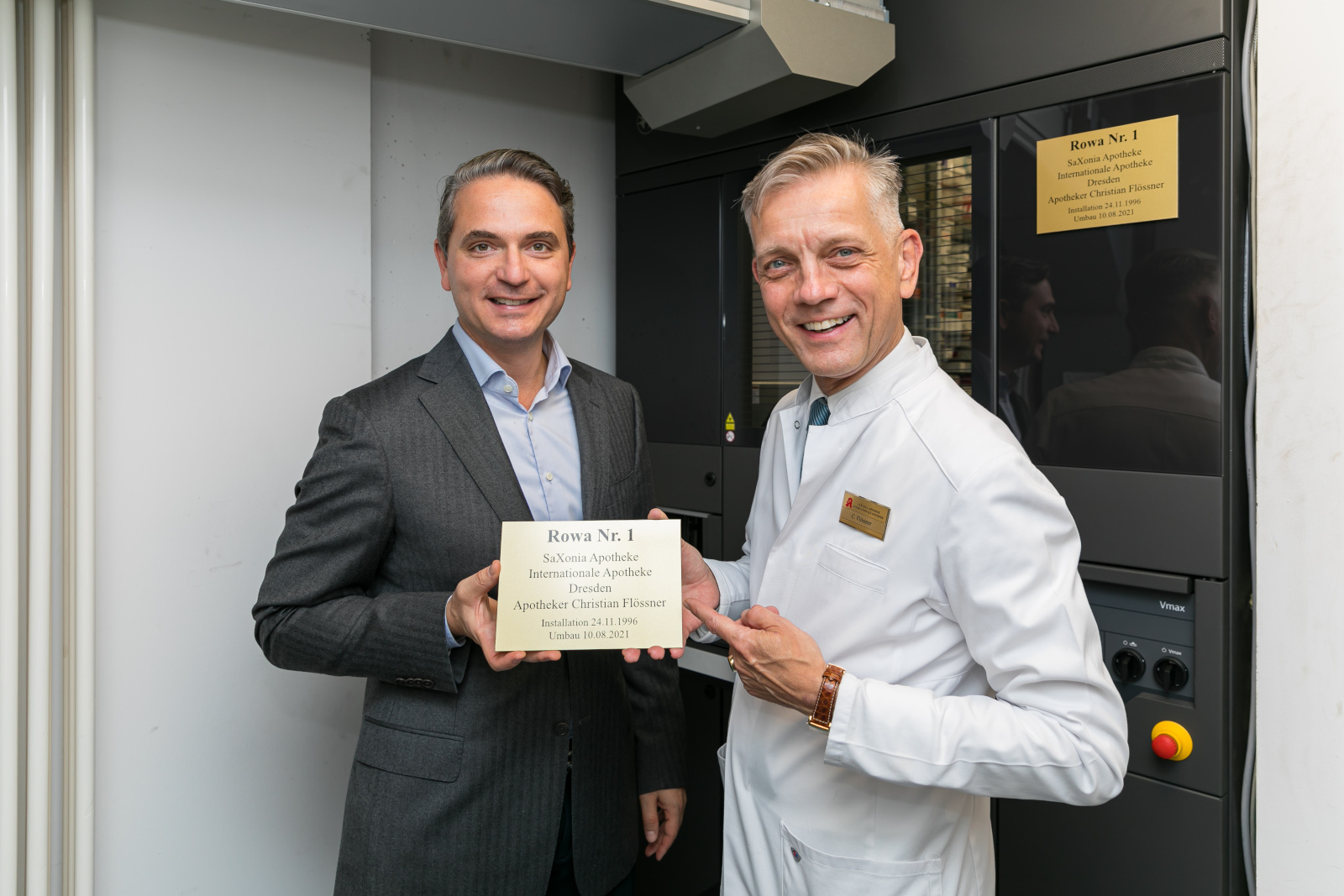 Als erster Kunde setzte Flössner 1996 auf das automatisierte Warenlager des noch sehr jungen Unternehmens Rowa. „Ich habe nach einer Lösung gesucht, die es mir ermöglichte, meine Apotheke in der Dresdner Innenstadt wirtschaftlich zu führen. Rowa hat mir hier eine Lösung geboten, die von Anfang an passte“, erinnert sich der Apotheker.