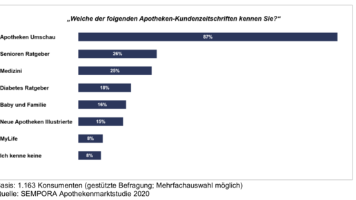 Innerhalb der letzten Jahre hat die Auswahl an Kundenmagazinen in der Apotheke in vielfältiger Weise zugenommen. 74 Prozent der befragten Apotheker finden die aktuelle Anzahl der Kundenmagazine zu hoch. Trotz der neuen Anbieter ist die Dominanz der Apotheken Umschau im Markt weiterhin hoch. Nur 35 Prozent der Apotheker sehen das Magazin MyLife (Burda/Noweda) als ernsthafte Konkurrenz zur Apotheken Umschau und nur 9 Prozent würden zukünftig auf die Umschau verzichten. 43 Prozent der befragten Hersteller halten die Apotheken Umschau für unverzichtbar für das Bewerben ihrer Marken.