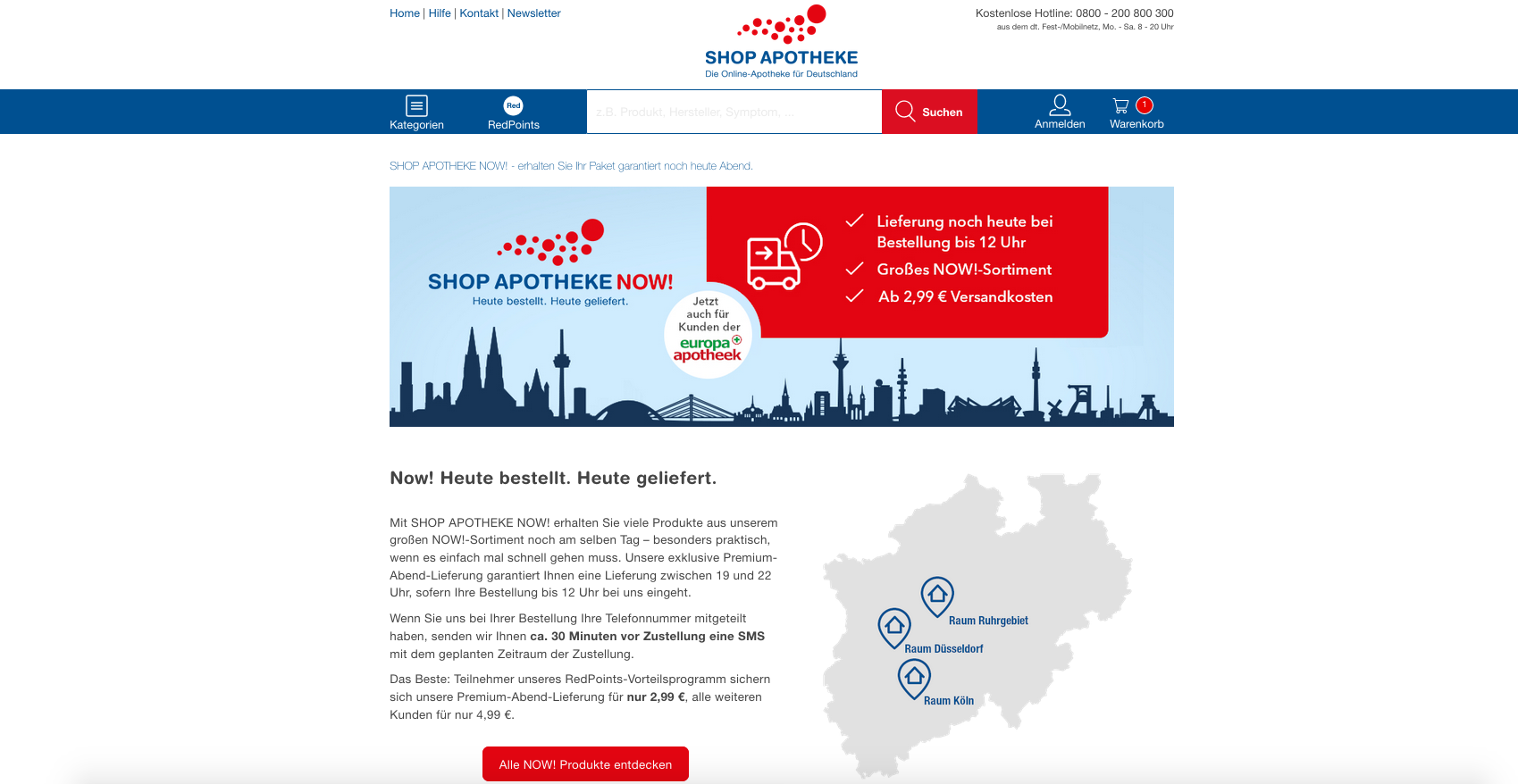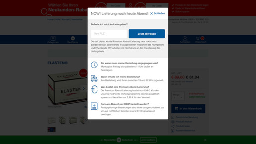 Die Premium-Abend-Lieferung garantiere eine Lieferung zwischen 19 und 22 Uhr, sofern die Bestellung bis 12 Uhr eingeht. Der Service steht bisher nicht allen Kunden offen. Lediglich die Regionen Ruhrgebiet, nördliches Rheinland, Köln und Düsseldorf sind angeschlossen. Wenn die Kunden bei ihrer Bestellung eine Telefonnummer mitgeteilt haben, erhalten sie etwa 30 Minuten vor Zustellung eine SMS mit dem geplanten Zeitraum der Zustellung. Für den Service werden Versandkosten von 4,99 Euro fällig. Teilnehmer des RedPoints-Vorteilsprogramms müssten nur 2,99 Euro zahlen. Für Rezepte gilt der Service nicht.
