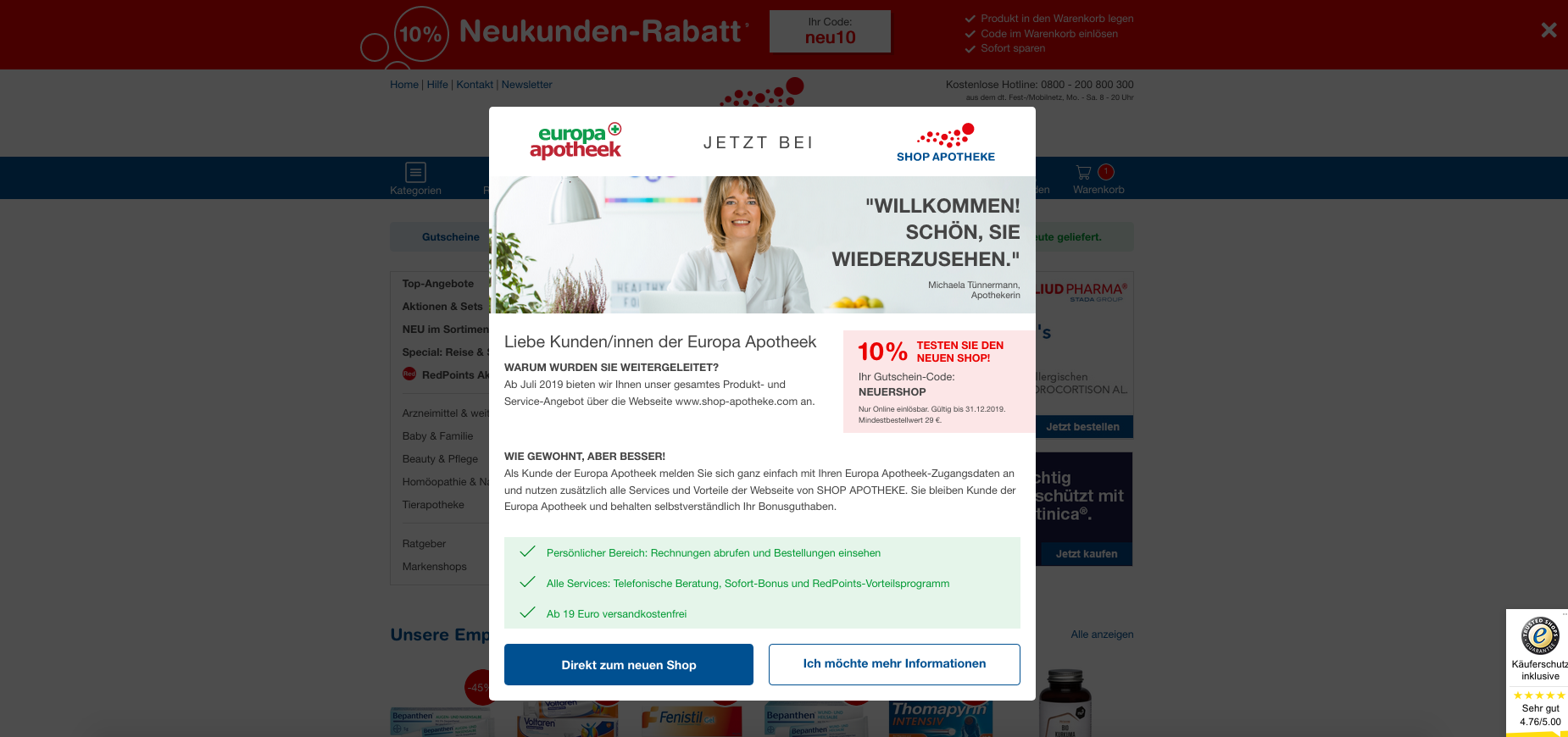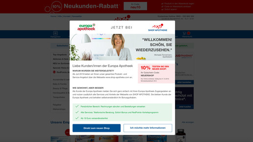 Wer die Adresse der Europa Apotheek ansteuert, landet seit Juli direkt bei der Shop-Apotheke. Dort heißt es: „Wie gewohnt, aber besser!“ Apothekerin Michaela Tünnermann begrüßt die Kunden mit: „Willkommen! Schön, Sie wiederzusehen.“ Die Kunden sollten sich auf ein „ganz neues Online-Einkaufserlebnis“ freuen, erklärt der Versender. „Der Webshop von Shop-Apotheke präsentiert sich modern und übersichtlich und lässt sich besonders einfach bedienen.“ Der EAV-Katalog, das Bonussystem und die Ansprechpartner blieben bestehen.