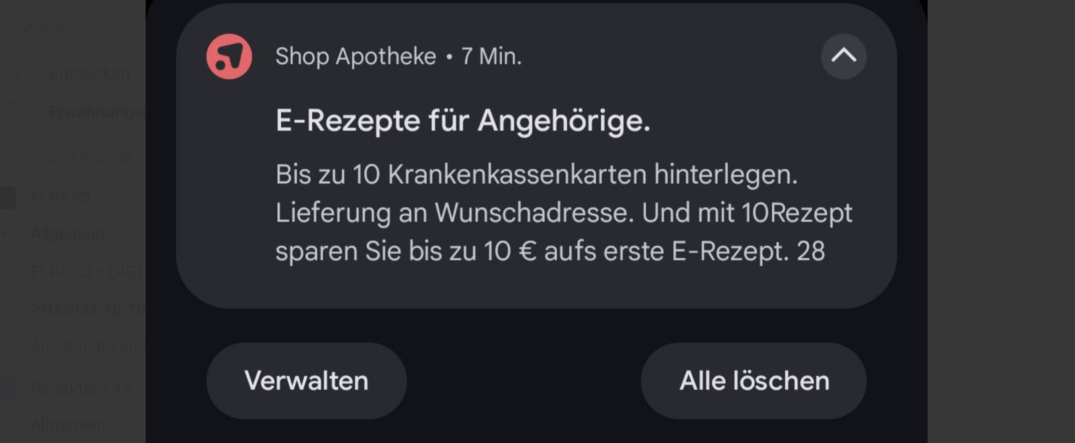 Shop Apotheke braucht mehr Rx-Rezepte, um die hochgesteckten Ziele einhalten zu können. Deshalb werden App-Nutzer jetzt darauf hingewiesen, nicht nur für sich, sondern auch für ihre Angehörige elektronische Verordnungen über Shop Apotheke einzulösen. „Bis zu 10 Krankenkassenkarten hinterlegen“, wirbt der Konzern für seine App.