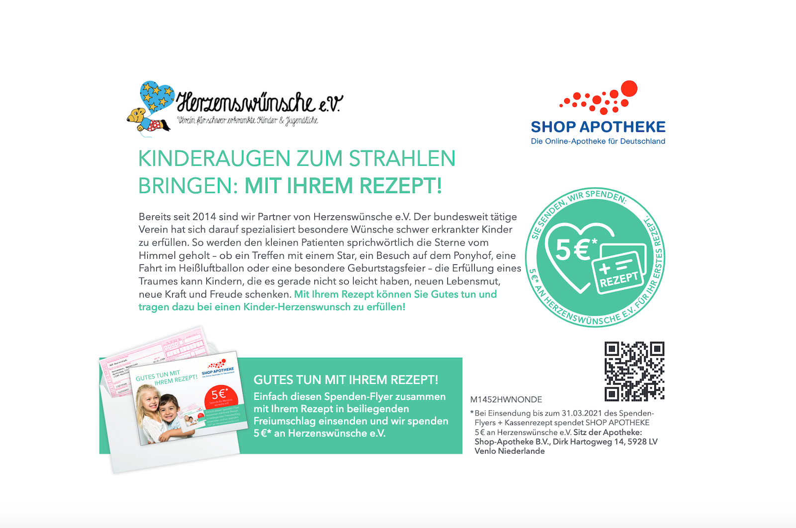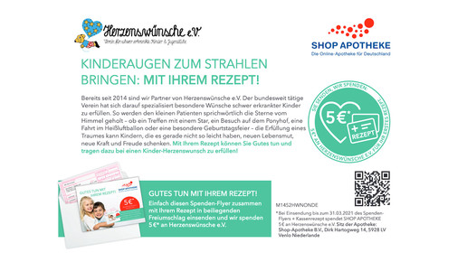 „Kinderaugen zum Strahlen bringen: Mit Ihrem Rezept!“ So wirbt Shop Apotheke seit kurzem für eine neue Rx-Prämie. „Sie senden, wir spenden — für Ihre erste Rezepteinsendung (nur gültig für Kassenrezepte)“, lautet das Motto. „Denn wir spenden für Ihr erstes Kassenrezept 5 Euro an Herzenswünsche e.V. So unterstützen Sie mit Ihrem Rezept schwer erkrankte Kinder bei der Erfüllung eines großen Wunsches.“ Das Rezept muss zusammen mit einem ausgedruckten Flyer eingeschickt werden, dann „können Sie, neben allen anderen Vorteilen, Kinder glücklich machen“.