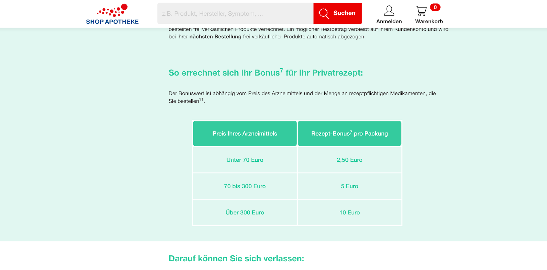 Nach wie vor gibt es aber bis zu 30 Euro Bonus für Privatversicherte: „Für jedes eingereichte Privatrezept erhalten Sie einen Bonus. Dieser liegt mindestens bei 2,50 Euro und maximal bei 10 Euro pro Medikamenten-Packung. Bei drei Medikamenten mit Maximalbonus können so bis zu 30 Euro Bonus erreicht werden. Der Bonus wird Ihrem Kundenkonto gutgeschrieben und mit dem Rechnungsbetrag Ihrer bestellten frei verkäuflichen Produkte verrechnet. Ein möglicher Restbetrag verbleibt auf Ihrem Kundenkonto und wird bei Ihrer nächsten Bestellung frei verkäuflicher Produkte automatisch abgezogen.“