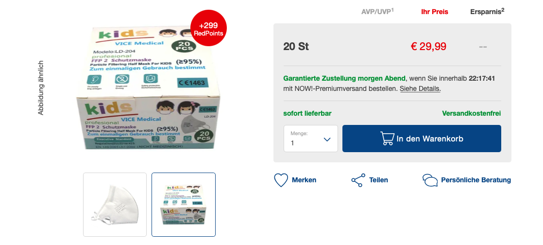 Der Verkauf von FFP2-Masken für Kinder ist immer wieder ein Thema in den Apotheken. Zwar werden bunte Kartons mit den halbfiltrierenden Masken angeboten, abgegeben werden dürfen sie jedoch nicht. Shop Apotheke bietet explizit FFP2-Masken „for kids“ an. Im Konformitätszertifikat ist von Kindern keine Rede.