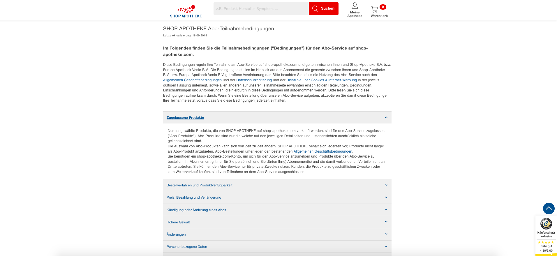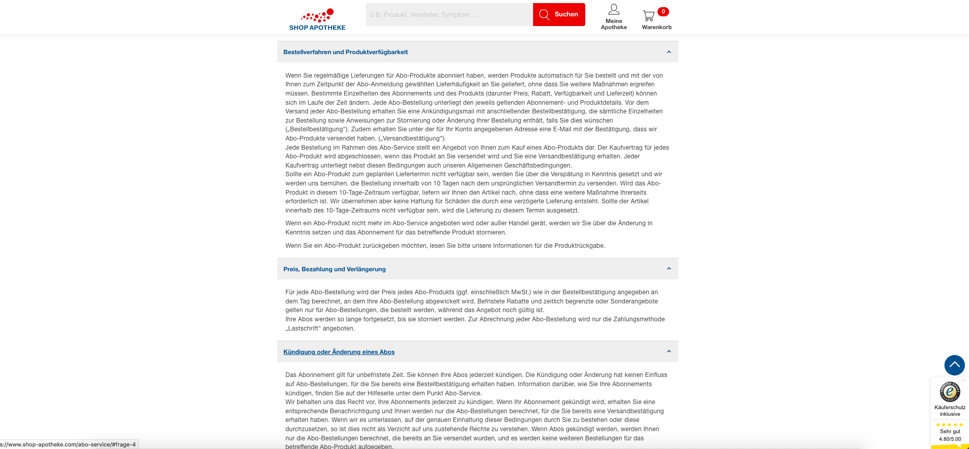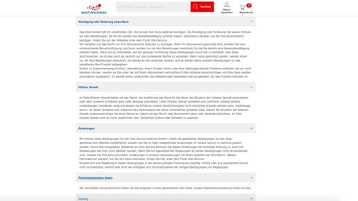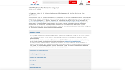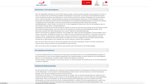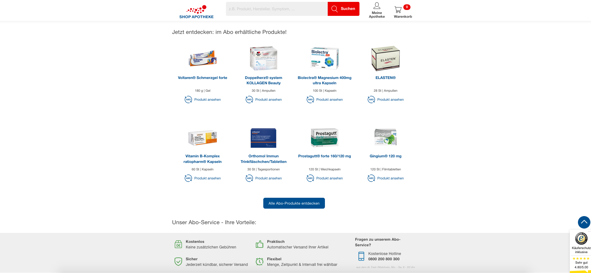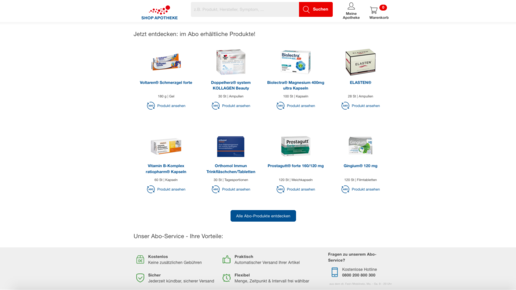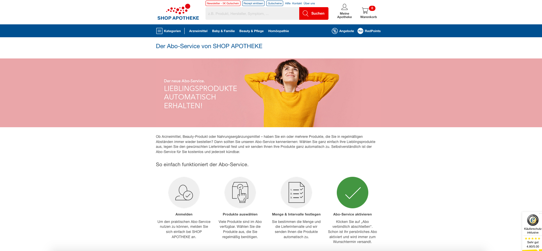 Bei Shop-Apotheke werden Kunden bereits seit längerem per Mail erinnert, wenn der zuletzt bestellte Vorrat zur Neige geht. Jetzt kann man gleich vorab ein Abo bestellen. Gleich auf der Startseite wird auf die neue Rubrik hingewiesen. „Bestellen Sie jetzt häufig benötigte Produkte bei Shop Apotheke im Abonnement. Ihre gewünschten Artikel werden Ihnen dann automatisch in von Ihnen festgelegten Intervallen geliefert. Sie müssen sich um nichts weiter kümmern. Natürlich ist das Einrichten eines Abos bei Shop Apotheke kostenfrei und lässt sich jederzeit durch Sie kündigen.“