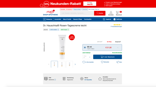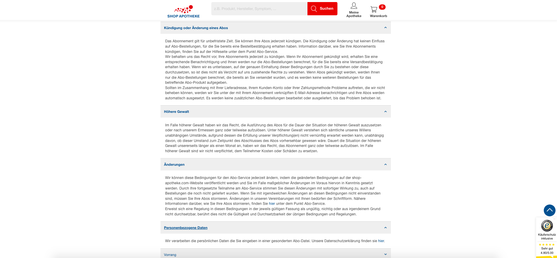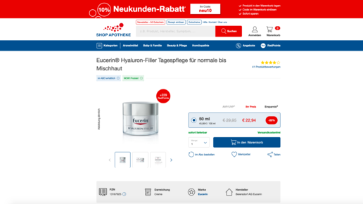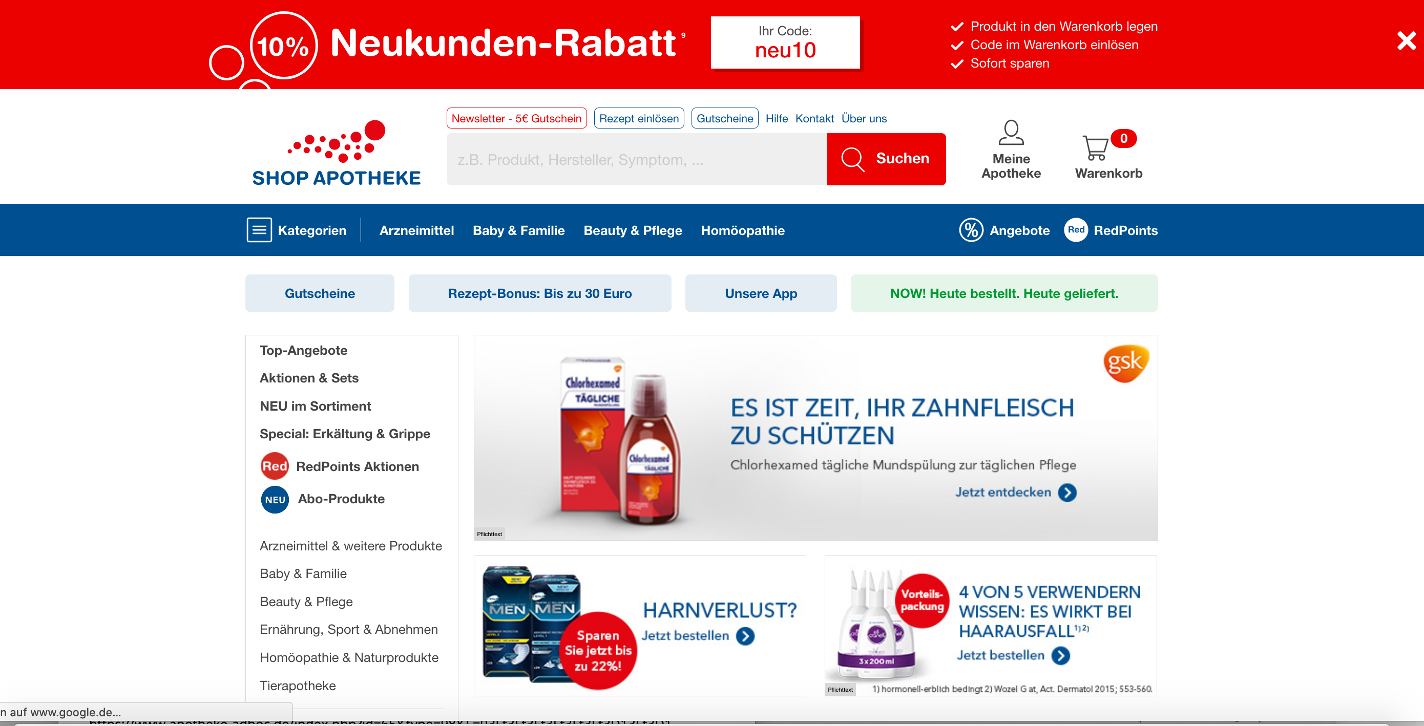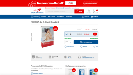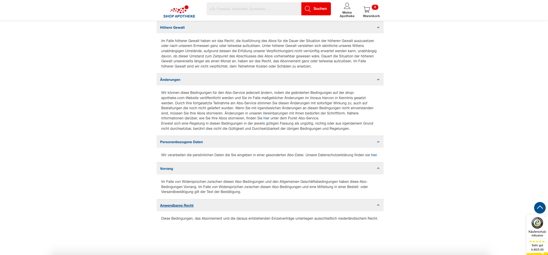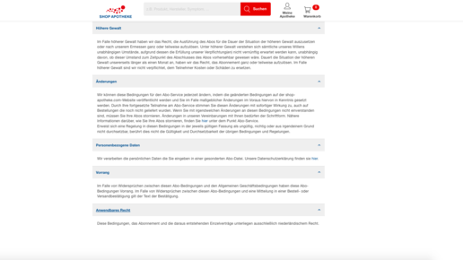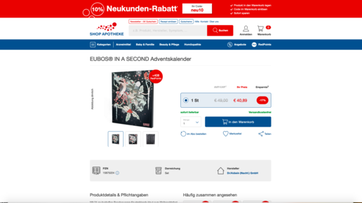 Bei Shop-Apotheke werden Kunden bereits seit längerem per Mail erinnert, wenn der zuletzt bestellte Vorrat zur Neige geht. Jetzt kann man gleich vorab ein Abo bestellen. Gleich auf der Startseite wird auf die neue Rubrik hingewiesen. „Bestellen Sie jetzt häufig benötigte Produkte bei Shop Apotheke im Abonnement. Ihre gewünschten Artikel werden Ihnen dann automatisch in von Ihnen festgelegten Intervallen geliefert. Sie müssen sich um nichts weiter kümmern. Natürlich ist das Einrichten eines Abos bei Shop Apotheke kostenfrei und lässt sich jederzeit durch Sie kündigen.“