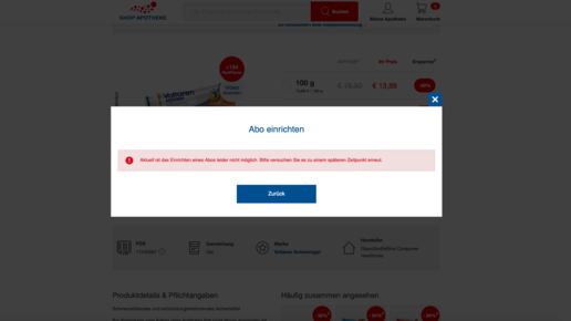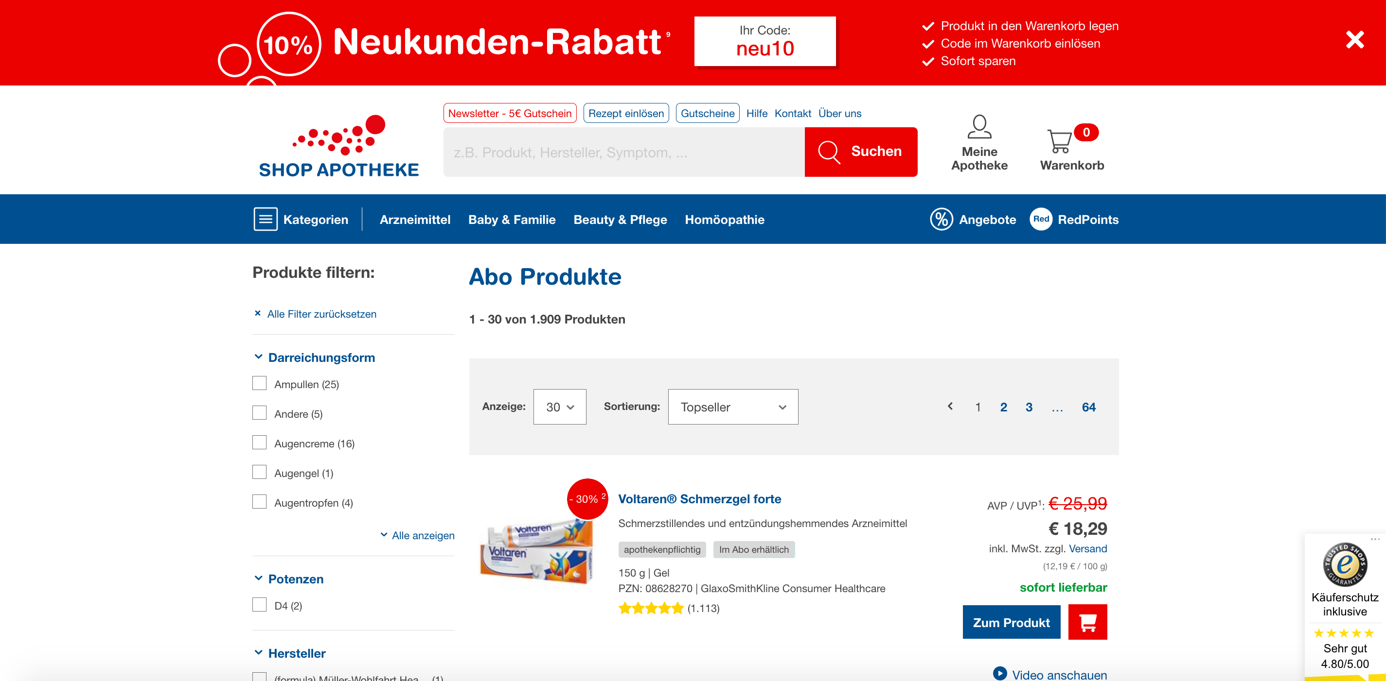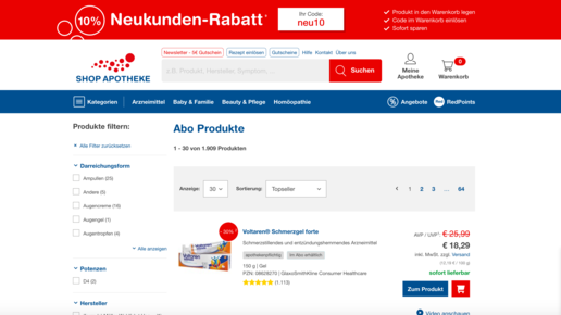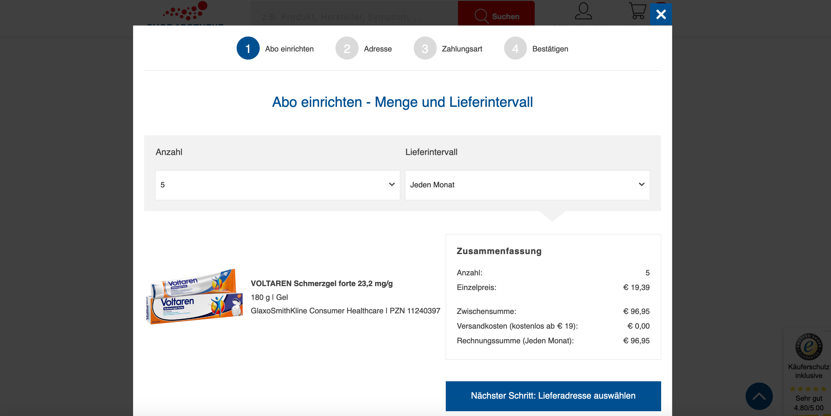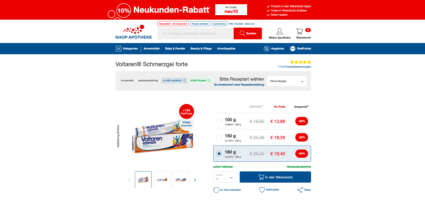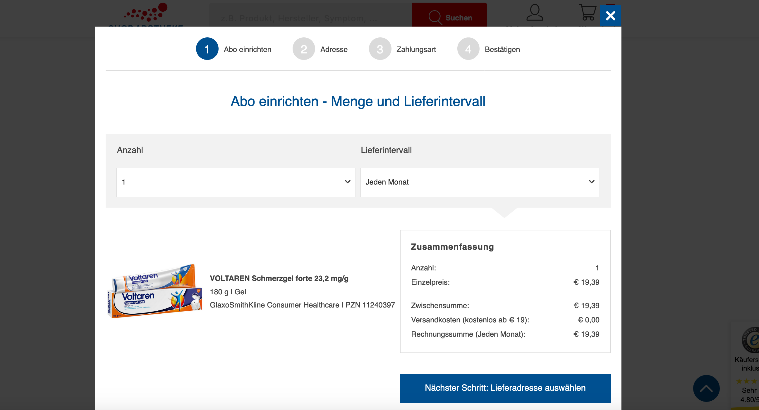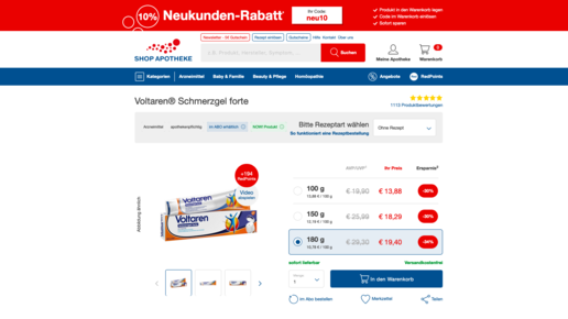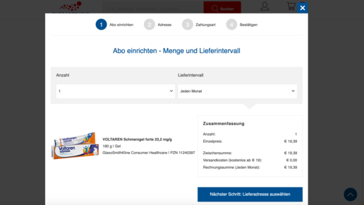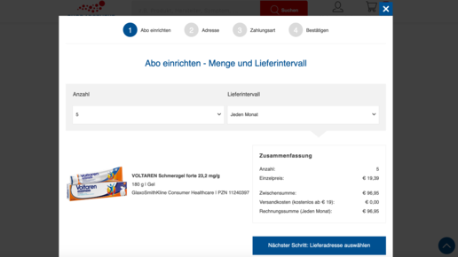 Allerdings sind Arzneimittel dabei – anders als etwa bei Amazon, wo seit Jahren Spar-Abos auch für freiverkäufliche Gesundheitsprodukte angeboten werden. So kann bei Shop Apotheke etwa Voltaren forte bestellt werden, und zwar monatlich bis zu fünf Packungen à 180 g. Man kann diese Höchstmenge sogar überschreiten, indem man bestätigt, dass es sich um eine Sammelbestellung handelt. Dann können bis zu 15 Packungen bestellt werden.