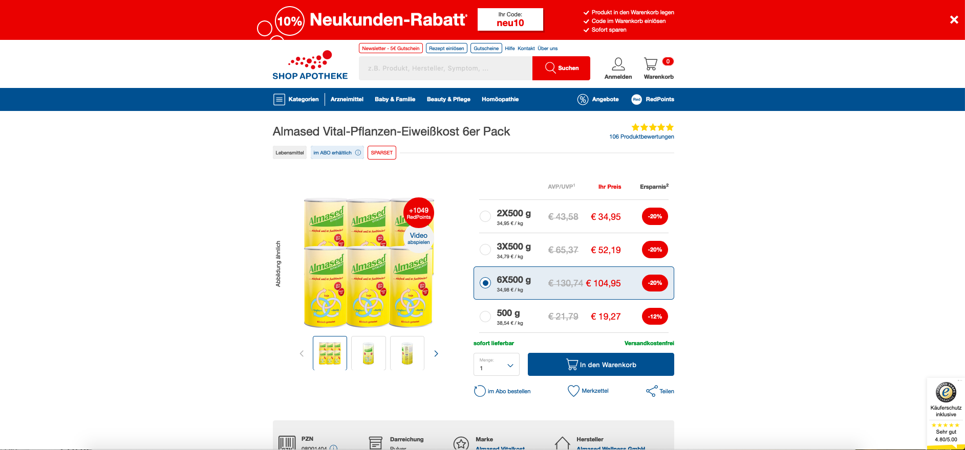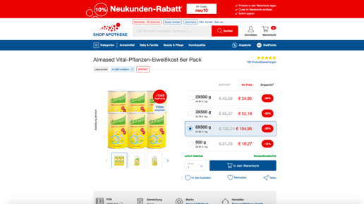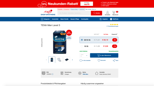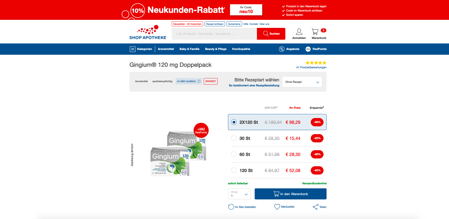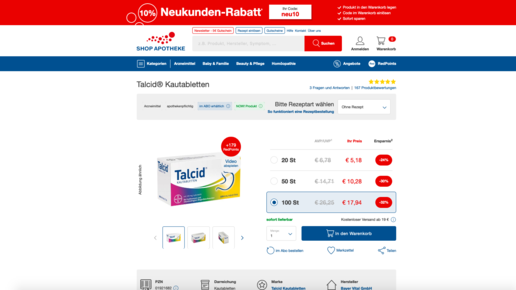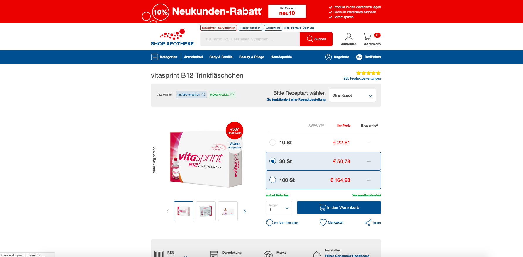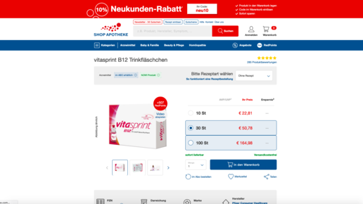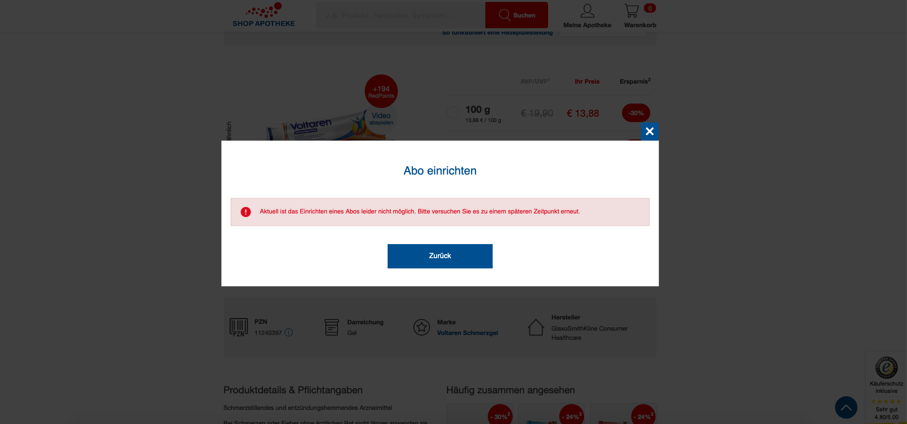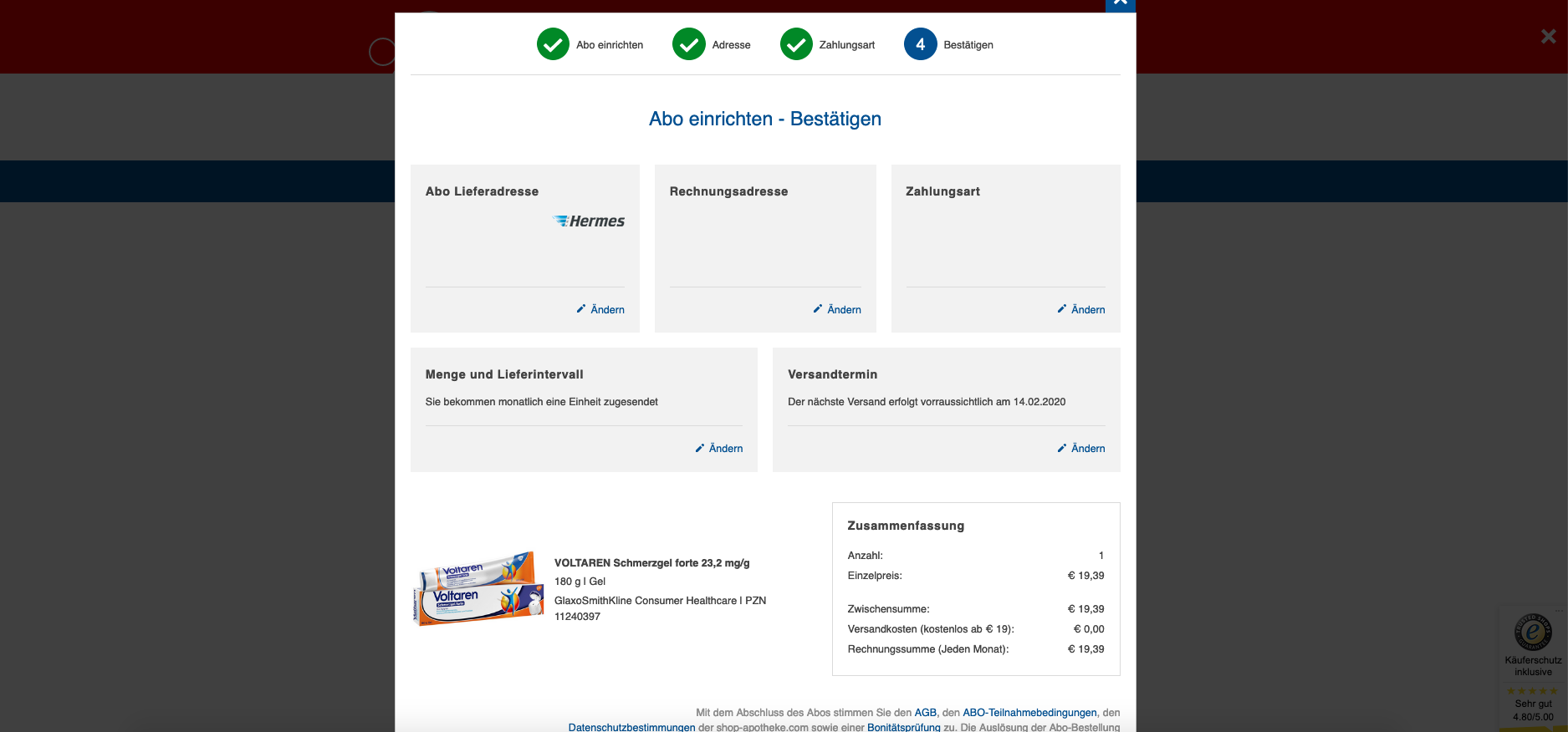 Allerdings sind Arzneimittel dabei – anders als etwa bei Amazon, wo seit Jahren Spar-Abos auch für freiverkäufliche Gesundheitsprodukte angeboten werden. So kann bei Shop Apotheke etwa Voltaren forte bestellt werden, und zwar monatlich bis zu fünf Packungen à 180 g. Man kann diese Höchstmenge sogar überschreiten, indem man bestätigt, dass es sich um eine Sammelbestellung handelt. Dann können bis zu 15 Packungen bestellt werden.