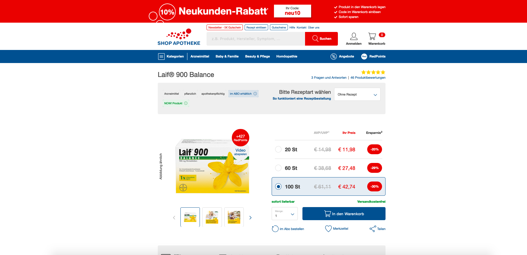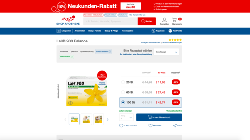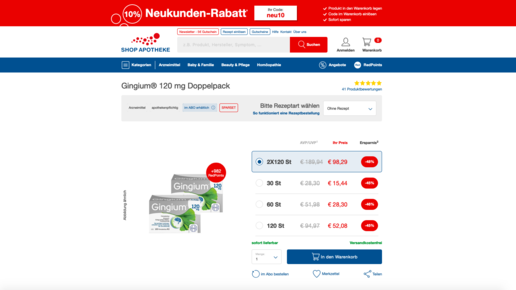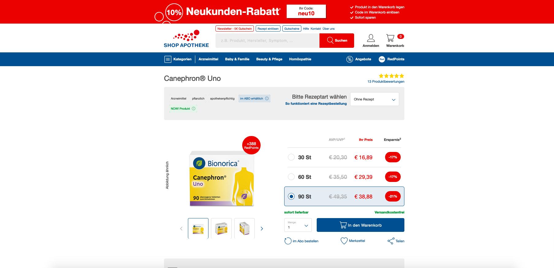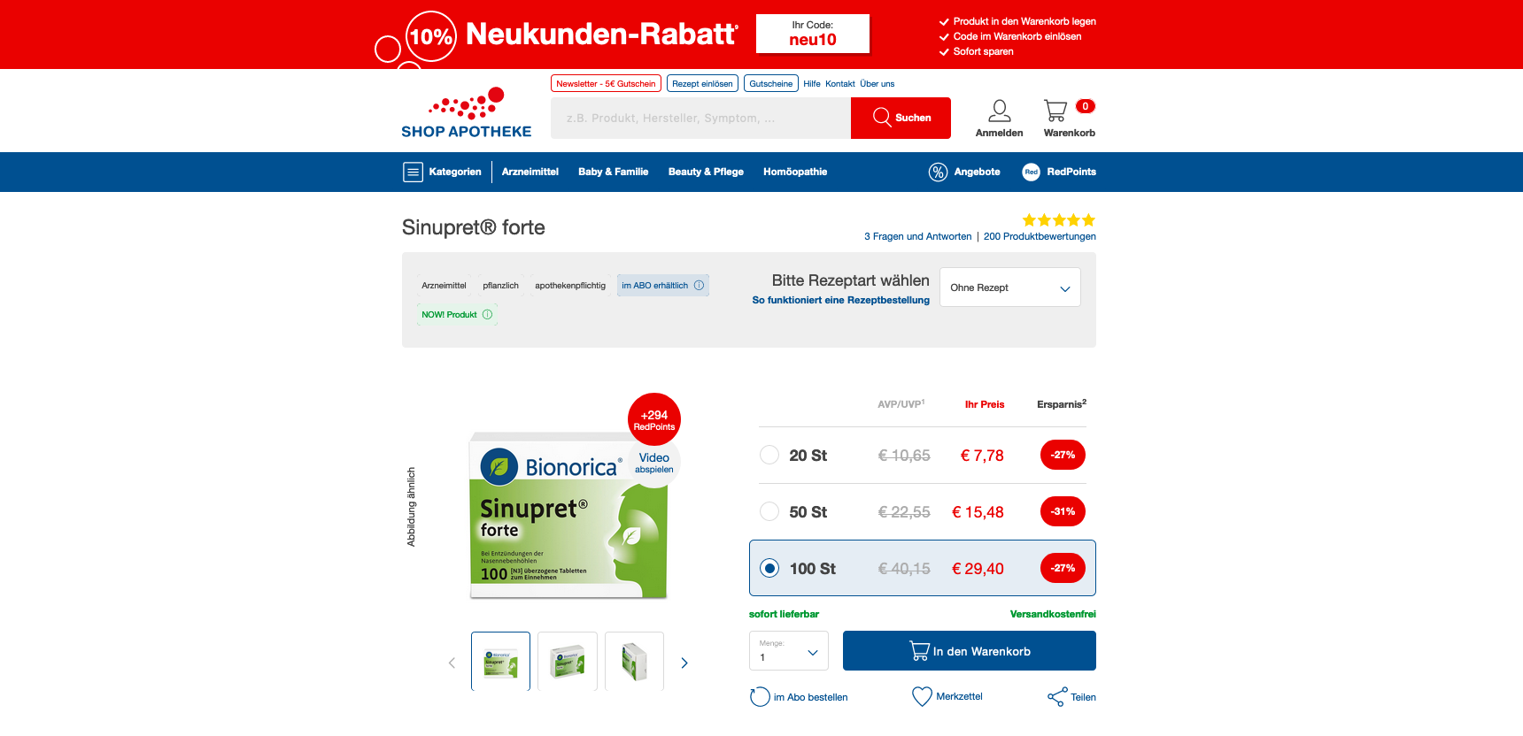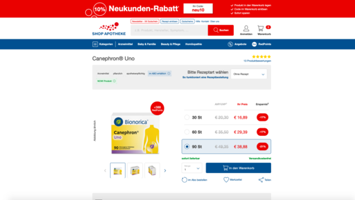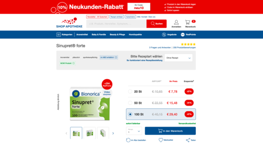 Bei Sinupret forte ist die Bestellmenge auf 15 Packungen à 100 Stück begrenzt; hier können bei Bestätigung einer Sammelbestellung insgesamt 17 Stück bestellt werden. Sinupret extract ist übrigens nicht im Abo erhältlich. Bei Bronchipret sind bis zu 14 Packungen à 100 Stück möglich, bei Canephron Uno sind es zwölf Einheiten à 90 Stück.