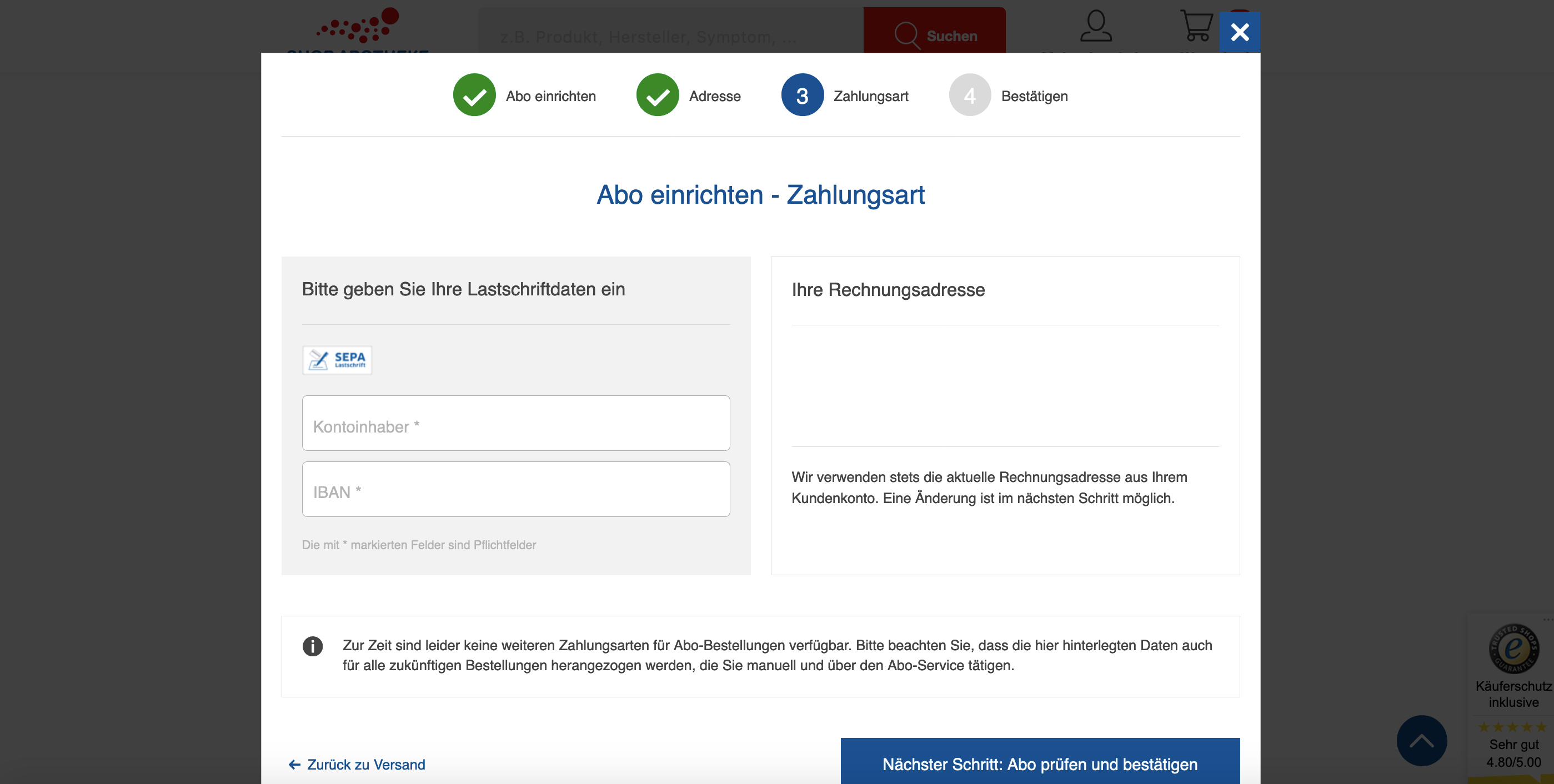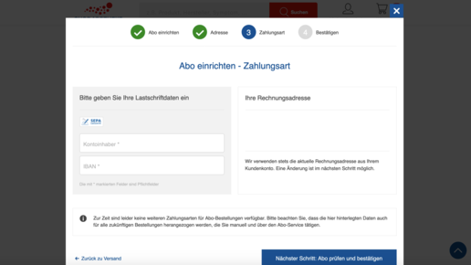 Zur Zahlung wird ein Lastschriftmandat erteilt; derzeit sind laut Unternehmen keine anderen Zahlungsarten möglich. Außerdem werden die hinterlegten Daten auch für alle zukünftigen Bestellungen herangezogen, die manuell oder über den Abo-Service getätigt werden. Im Kundenkonto können die Abos gekündigt werden.