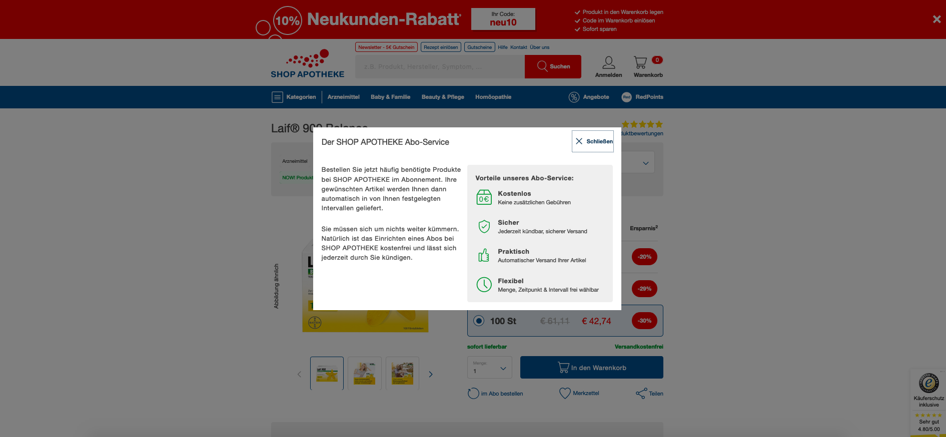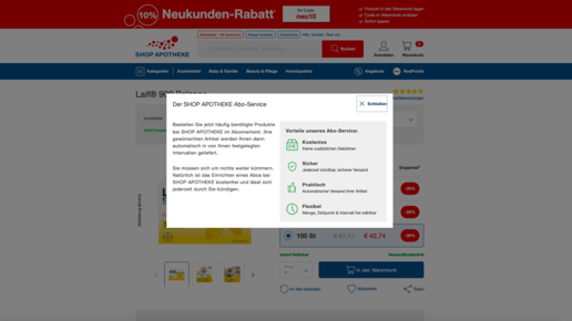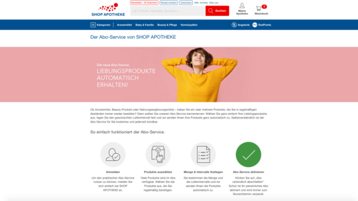 Amazon macht es vor, die Shop Apotheke macht es nach: Beim Versender aus Venlo können Kunden jetzt bestimmte Produkte im Abo bestellen. Dabei sind nicht nur Kosmetika und Nahrungsergänzungsmittel, sondern auch Arzneimittel, die nicht für den Dauergebrauch vorgesehen sind.