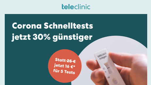 Corona-Laientests gibt es bei Teleclinic aktuell zum Sonderpreis: Gerade einmal 3,20 Euro kostet ein Test bei Bestellung eines 5er-Packs. Damit hat der Telemedizin-Anbieter, der wie DocMorris zu Zur Rose gehört, den Preiskampf auf ein neues Level gehoben.