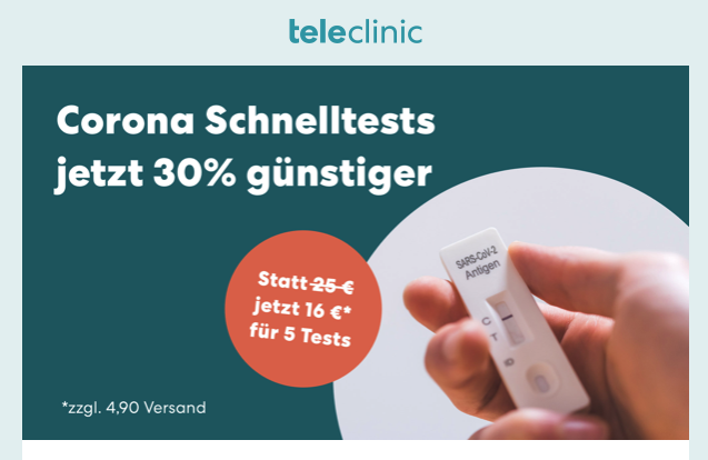 Angeboten wird der nasale Test von Hotgen. Normalerweise bietet Teleclinic fünf Tests für 25 Euro an, also fünf Euro pro Test. Das entspricht den gängigen Preisen der Versandapotheken und Discounter. Nun senkt der Telemedizin-Anbieter den Preis „für kruze Zeit“ um 30 Prozent auf 3,20 Euro, also 16 Euro pro Packung. „Bestellen Sie jetzt und schützen Sie sich und Ihre Mitmenschen“, heißt es.