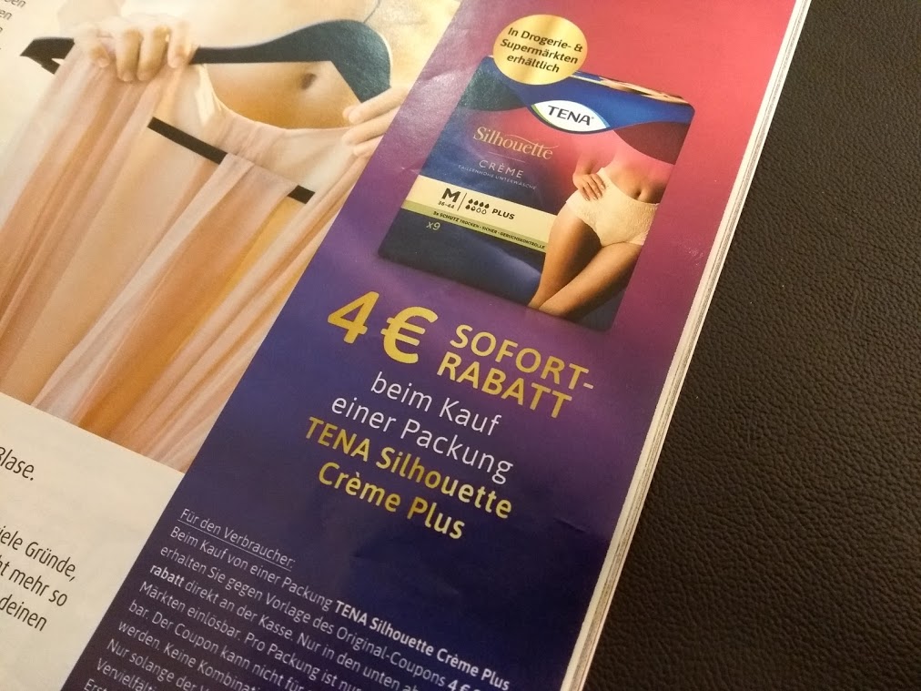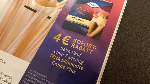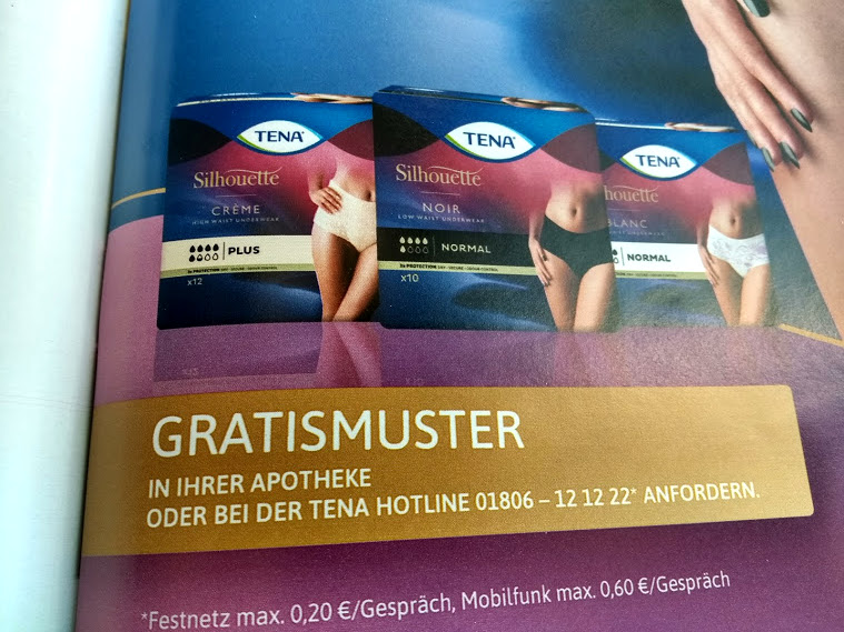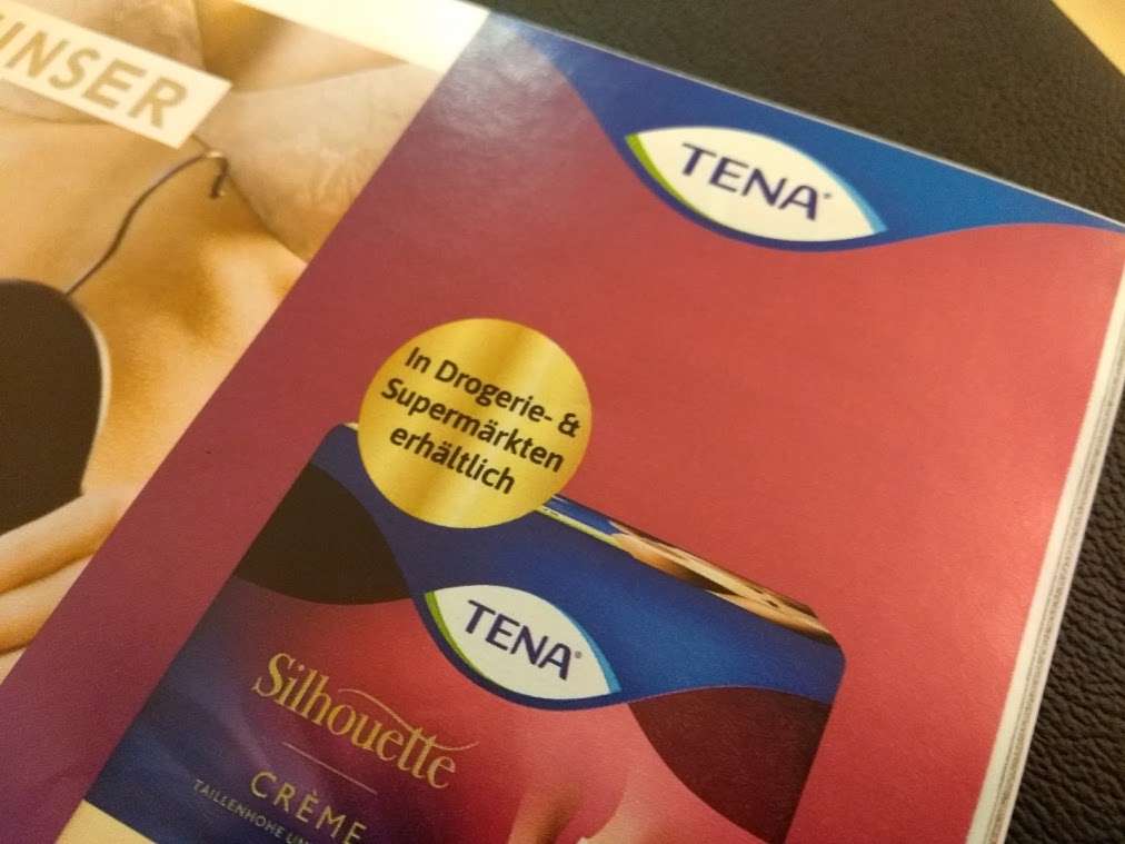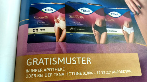 Tena wirbt derzeit auf verschiedenen Wegen für die neue Einwegunterwäsche Silhouette Plus Crème. Sie fühlt sich laut Hersteller an wie echte Unterwäsche und ist in taillen- oder hüfthohem Design erhältlich. In der Apotheken Umschau wird auf einer ganzseitigen Anzeige für das Modell mit einem Gratismuster geworben. Dies gebe es „in ihrer Apotheke“ oder bei der Tena-Hotline, heißt es in der Annonce. Auf die Bezugsquelle Drogerie- und Supermärkte wird nicht hingewiesen.