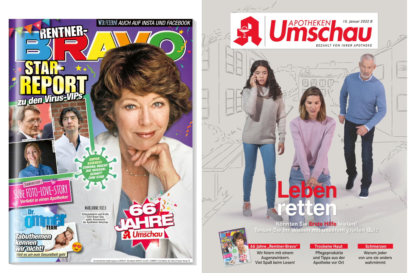 Getreu dem Motto „Mit 66 Jahren da fängt das Leben an“ feiert der Wort & Bild Verlag den besonderen Geburtstag seines Flaggschiffs Apotheken Umschau. Und da das Magazin den Spottnamen „Rentnerbravo“ sowieso schon hat, nimmt sich der Verlag mit einem 10-seitigen Bravo-Sonderheft ein bisschen selbst auf den Arm.