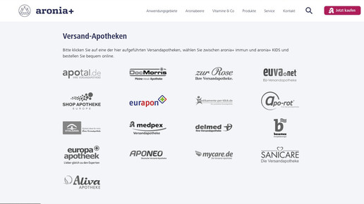 Darunter werden auf der Website als Alternative ausgesuchte Versandapotheken namentlich empfohlen und auch gleich in deren Shops verlinkt: „Bitte klicken Sie auf eine der hier aufgeführten Versandapotheken, wählen Sie zwischen Aronia+ immun und Aronia+ Kids und bestellen Sie bequem online“, heißt es zur Einführung.