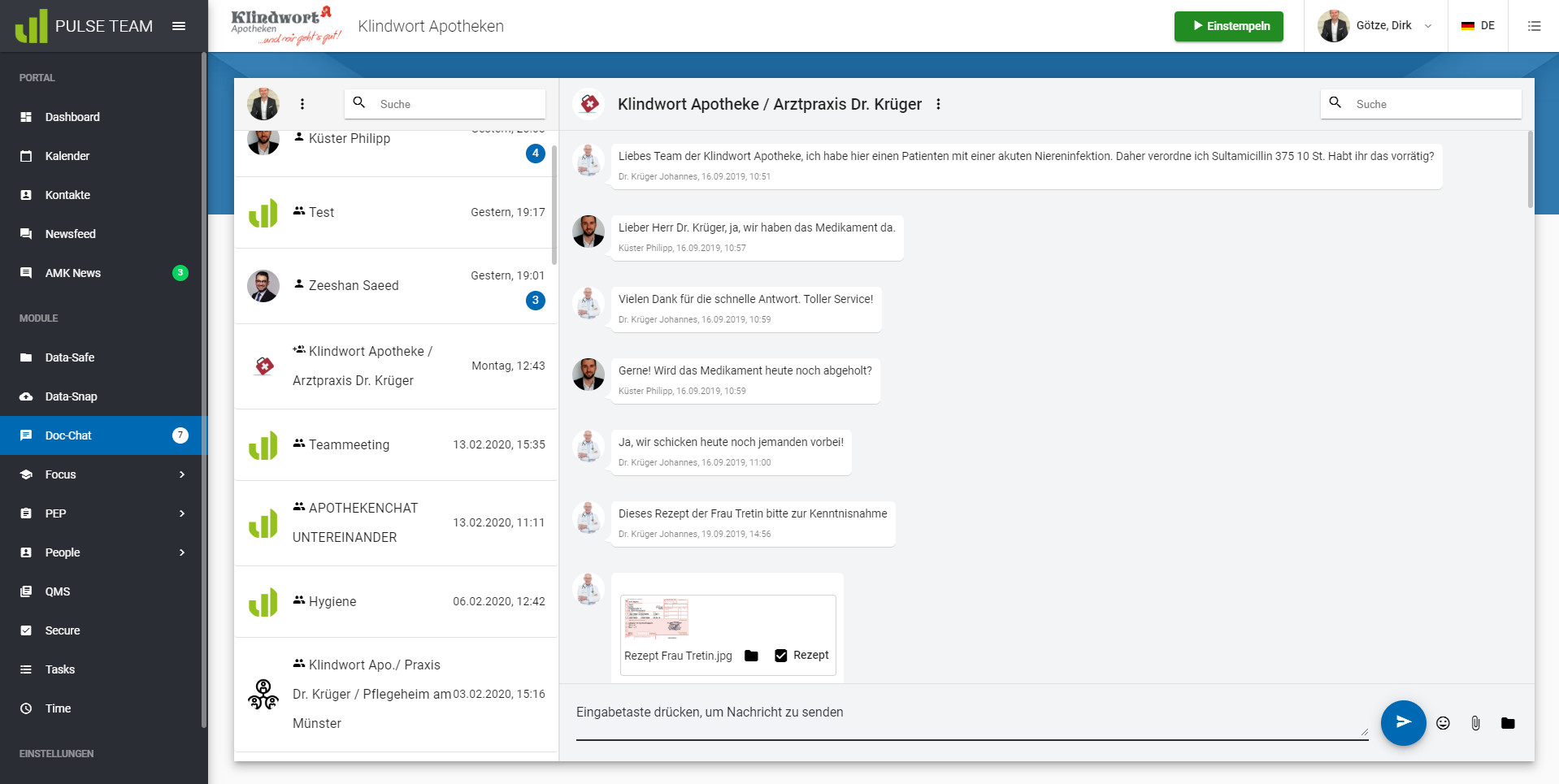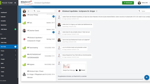 Über ein Smartboard seien die Funktionen dann über den Internetbrowser steuerbar, neben Kommunikation einzeln und in Gruppen und einem Personalplanungstool können demnach auch Dokumente wie Rezepte sicher zwischen allen Teilnehmern verschickt werden. Die Anmeldung läuft über die Internetseite von Pulse: Dort können sich Interessenten derzeit kostenlos registrieren, um das Tool Doc Chat zu nutzen. „Diese einmalige Registrierung auf unserer Website gilt aktuell nur für Apotheken, Ärzte, Städte / Gemeinde- und Verbandsgemeindeverwaltungen und Behörden“, betont Pulse dort. Ein Enddatum für die kostenlose Nutzung hat das Unternehmen aus Nürnberg und Königstein noch nicht bekanntgegeben. Eine Registrierung werde später aber nicht zu einem automatischen kostenpflichtigen Abonnement umgewandelt.