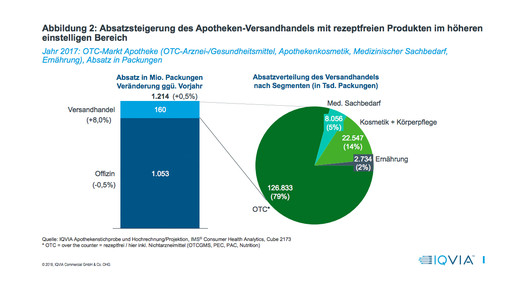 Im seit Jahren gewohnten Umfang setzte der Versandhandel mit rezeptfreien Produkten, Arznei- und Gesundheitsmitteln, Kosmetika, Produkten zur Ernährung und zum medizinischen Sachbedarf bereits 2017 seinen Wachstumskurs fort. Das OTC-Geschäft über den elektronischen/telefonischen Bestellweg wuchs laut Iqvia nach Umsatz niedrig zweistellig (plus 12 Prozent) und nach Absatz im höheren einstelligen Bereich (plus 8 Prozent).