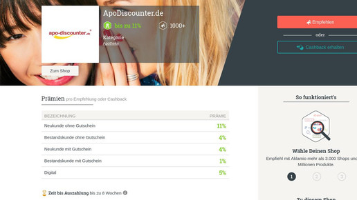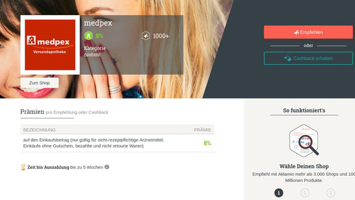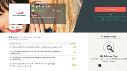 Auf Aklamio sind sieben Versandapotheken gelistet: Shop-Apotheke, Versandapo.de, Medpex, Apo-Discounter, Sanicare, Zur Rose und Apotal. Die Mitglieder auf dem Portal können die Versender per E-Mail, Facebook, Twitter, Google Plus oder mittels eines Links an ihre Freunde weiterempfehlen. Klicken diese auf die Empfehlung und kaufen etwas in der Versandapotheke, erhält der Empfehler eine Prämie. Verschreibungspflichtige Produkte sind in der Regel von der Aktion ausgeschlossen.