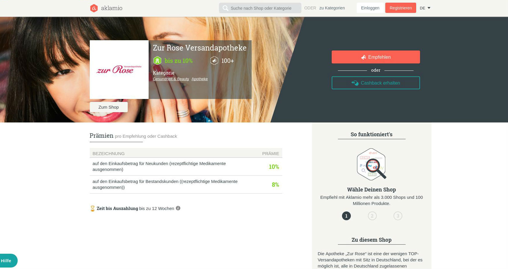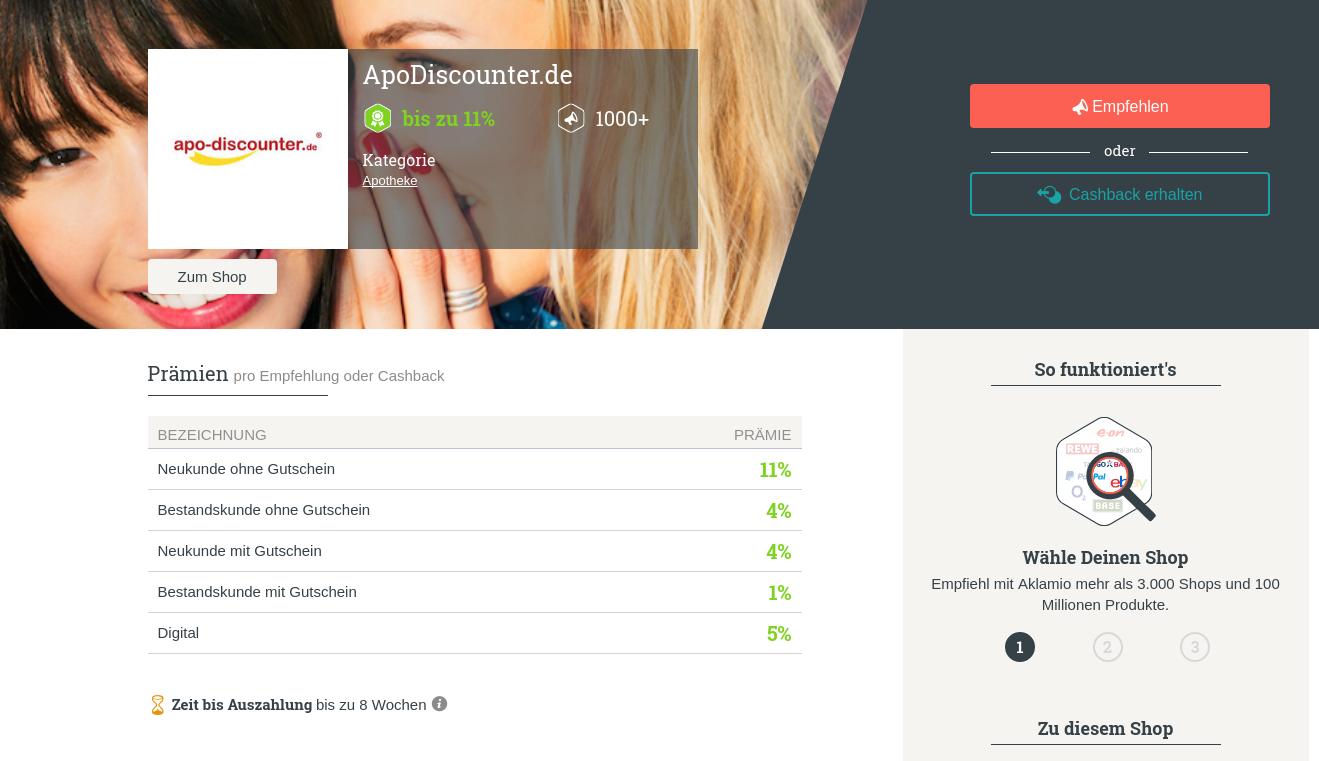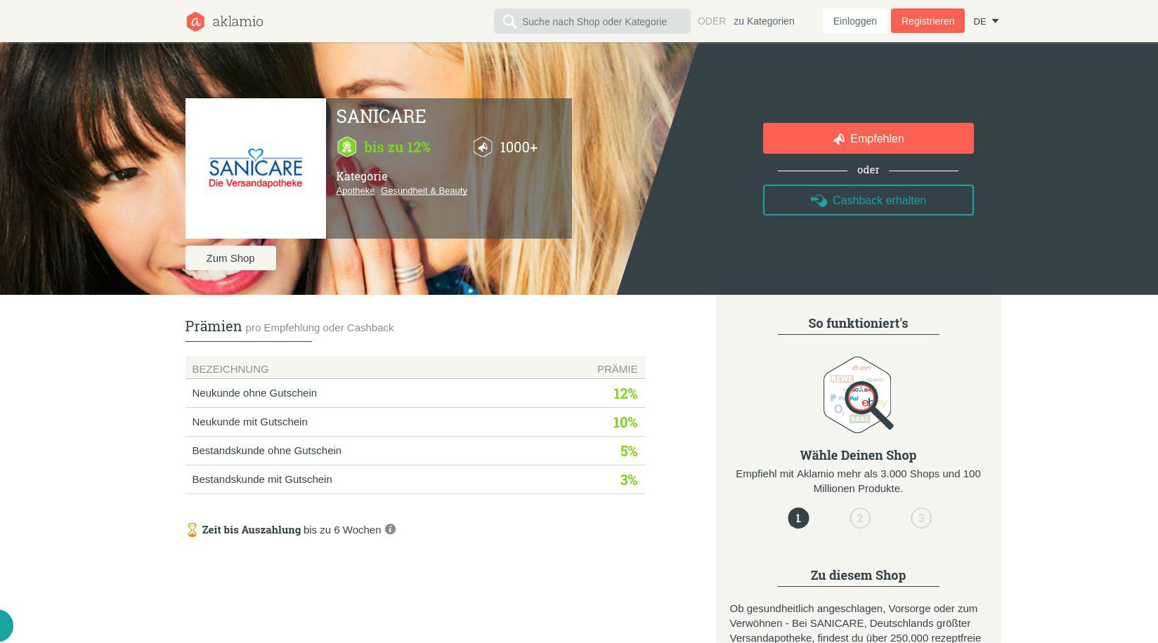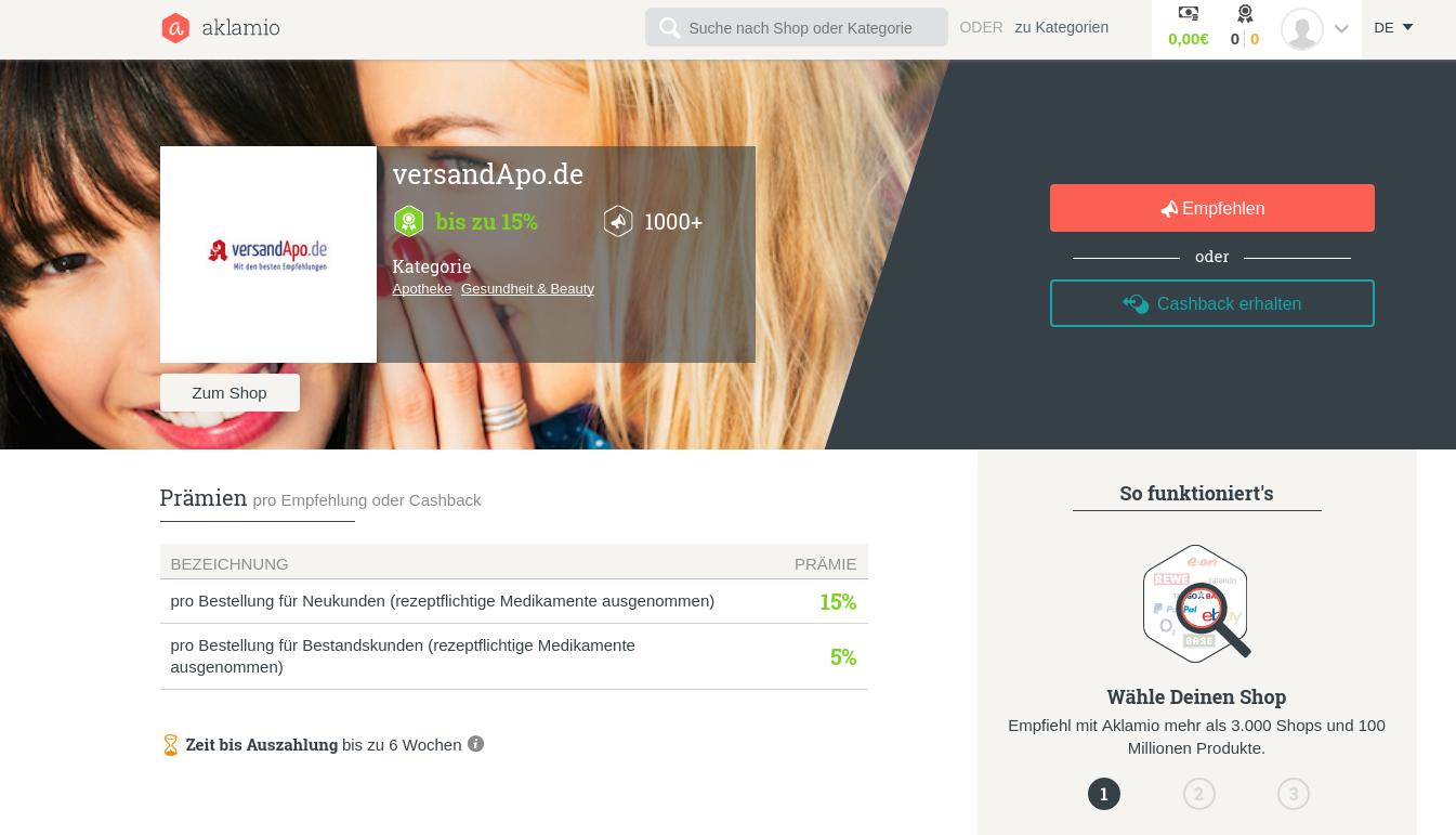 Auf Aklamio sind sieben Versandapotheken gelistet: Shop-Apotheke, Versandapo.de, Medpex, Apo-Discounter, Sanicare, Zur Rose und Apotal. Die Mitglieder auf dem Portal können die Versender per E-Mail, Facebook, Twitter, Google Plus oder mittels eines Links an ihre Freunde weiterempfehlen. Klicken diese auf die Empfehlung und kaufen etwas in der Versandapotheke, erhält der Empfehler eine Prämie. Verschreibungspflichtige Produkte sind in der Regel von der Aktion ausgeschlossen.